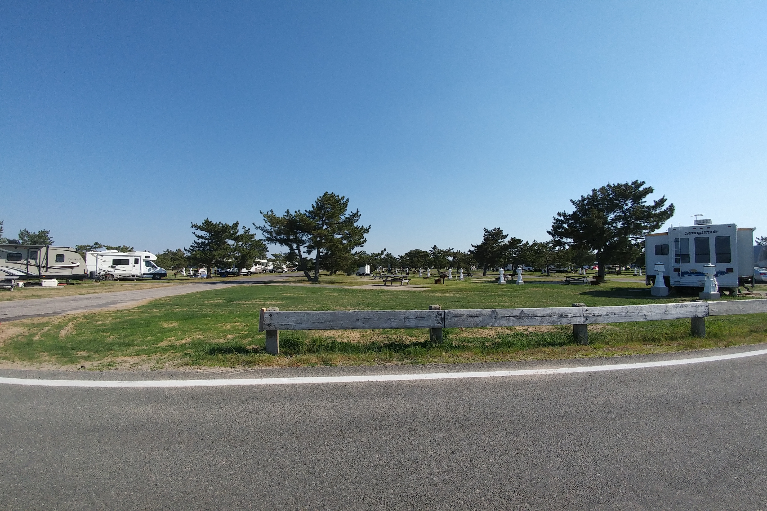 Well, it is certainly a beach – a very nice, sandy beach – but it is also a huge campground. 438 sites, mostly for RVs but some tent-only sites, too. They are all water/electric (no sewer), but the park has a huge 4-lane dump station for emptying your tanks as you leave. The summer rates for an RV site are under $35 a day, making it very affordable (most private RV parks in Massachusetts charge over $50 per day) and it is very close to the beach. An easy walk. The problem, for us, is that there is a 40-foot limit on the RV length (we are 42) and there is a 14-day limit on the number of days you use the campground during the summer season. But for people who want a very nice campground for a short stay near the beach in MA, this is a great option.The other problem for us, as seniors, is that the $10 annual senior pass for day use is limited to MA residents. Ah, finally a downside to being FL residents.