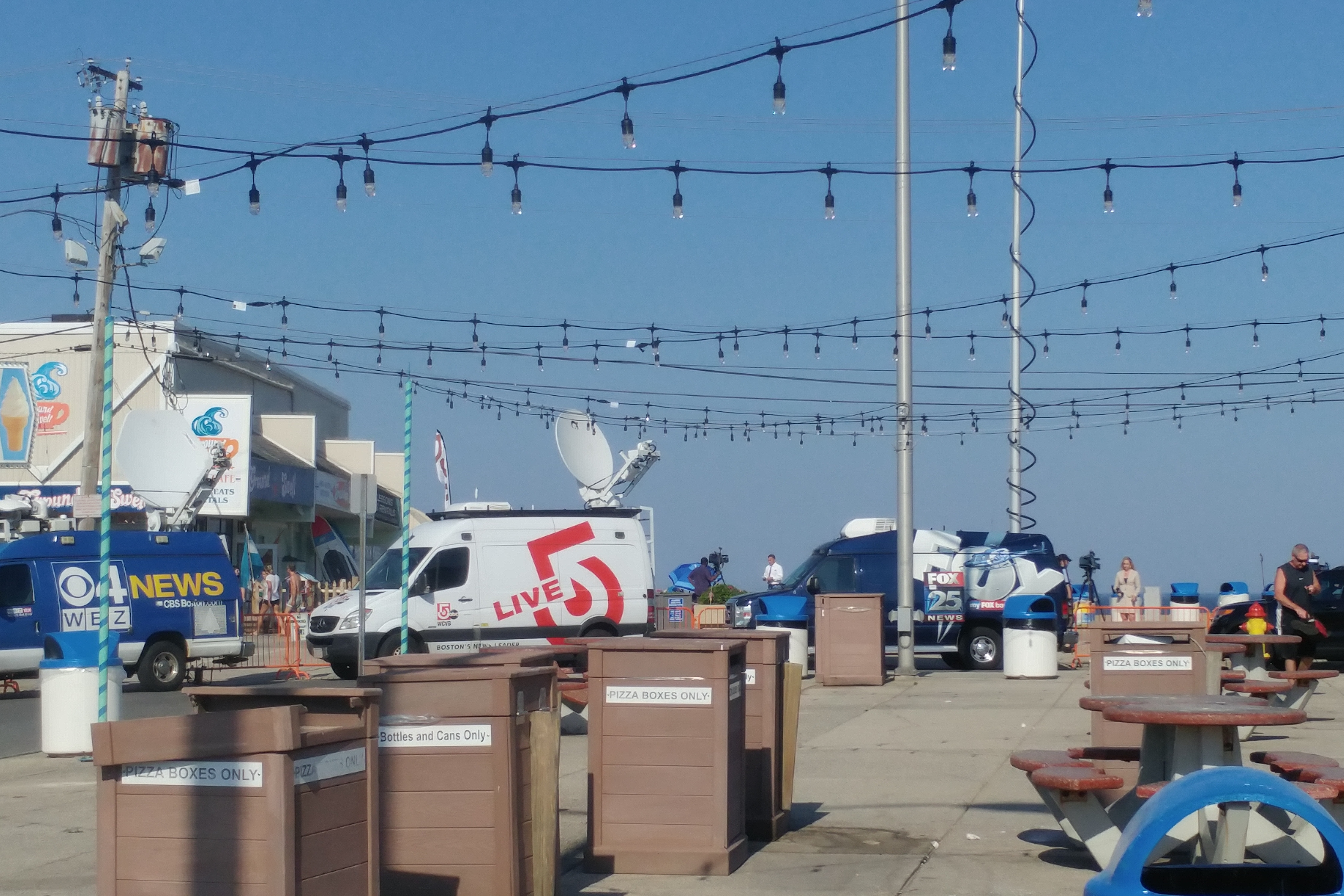 Since the reservation is very near “downtown” Salisbury Beach – a small honkytonk beach town – I dropped by there for a few minutes, too. I was surprised to see a bunch of remote TV station vans set up and broadcasting. As it was after 5pm it was obvious that they were doing live segments from Salisbury Beach. I wondered what the story was. Well, it turns out that the body of a fisherman who had gone missing a few days before washed up on the beach that afternoon. Must have been an unpleasant surprise for the families and the small children who were trying to get a break from the 94-degree heat.