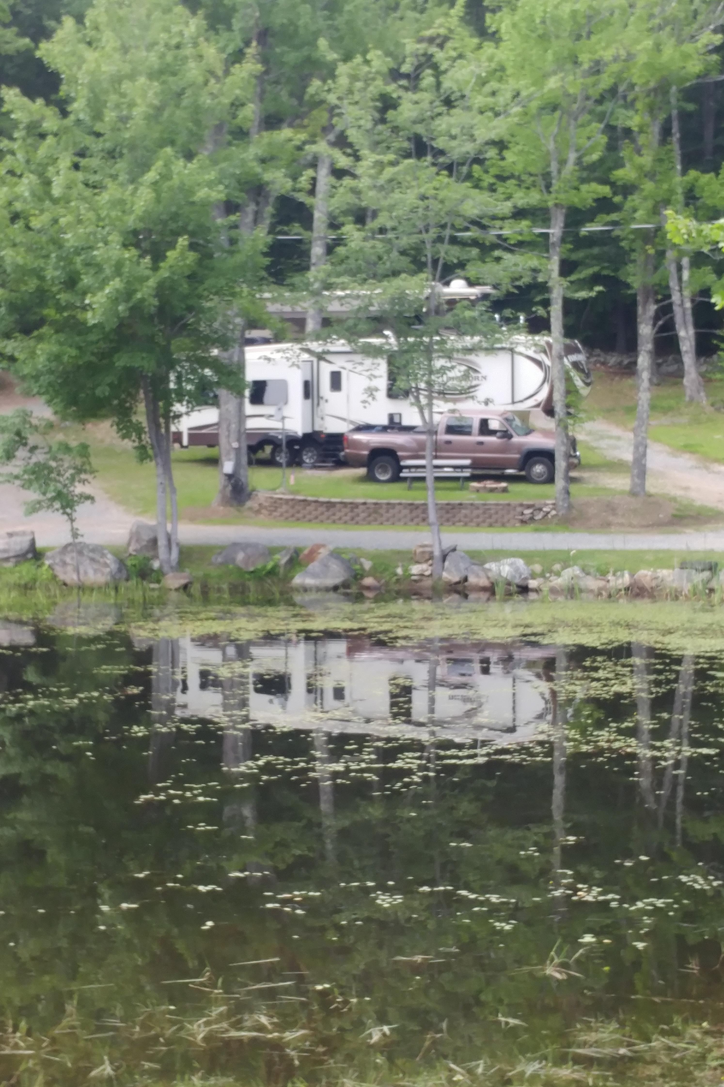 It has changed very little in 5 years. The things we liked then – the solitude, the cute pond, the friendly hosts (even though the hosts are different now than they were then) – are still the things we like now. The things we didn’t like much then – the difficult, sometimes cramped, sites, the lack of sewer service on most sites and very limited TV antenna reception – are still the things we don’t like much now. In 2012 we paid for cable TV, but that wasn’t an option this time, so we survived mostly by watching DVDs.