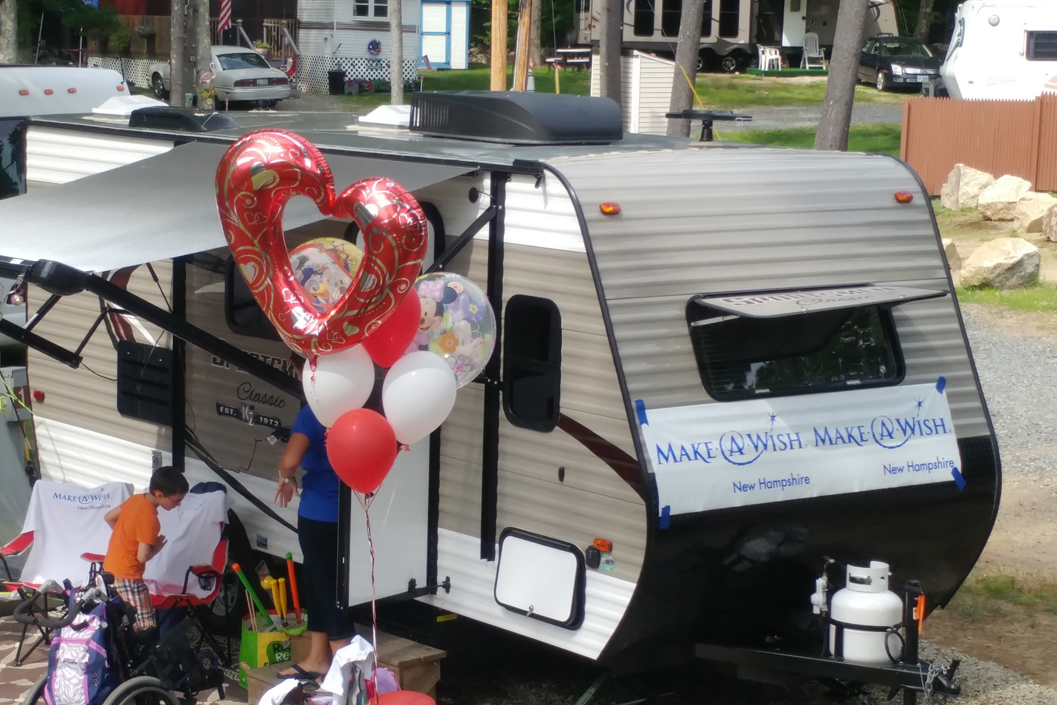 The campground, in association with other NH campgrounds, sponsored a Make-a-Wish event on the day we arrived. The Make-a-Wish Foundation bought a small trailer for a mother and her two children, the younger one having a terminal illness. The camper is welcome, free of charge, at a number of campgrounds in southern NH this summer, to satisfy the mother’s wish of giving her daughter a summer of camping. It was a touching ceremony and a great opportunity to meet the hosts, the mother and her family and the other campers.