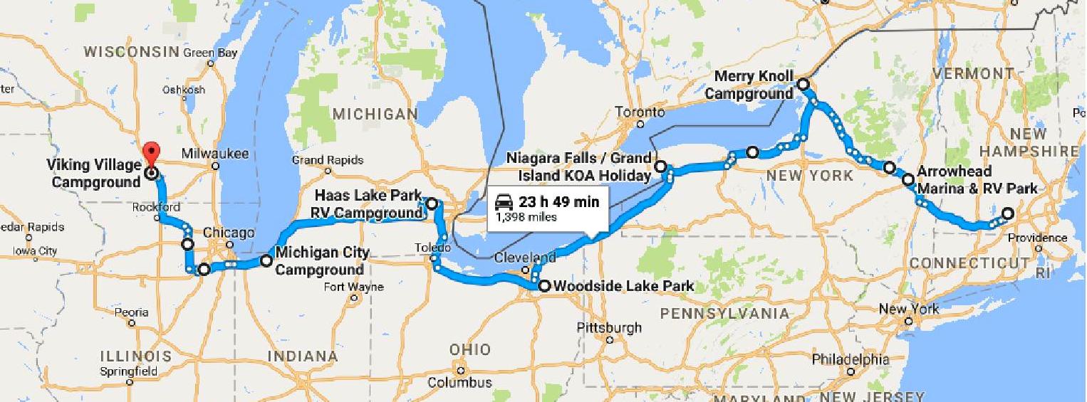 The first segment is from Oakham MA to Madison WI. About 1400 miles over 7 hops and 27 days. Things we will see and do include: