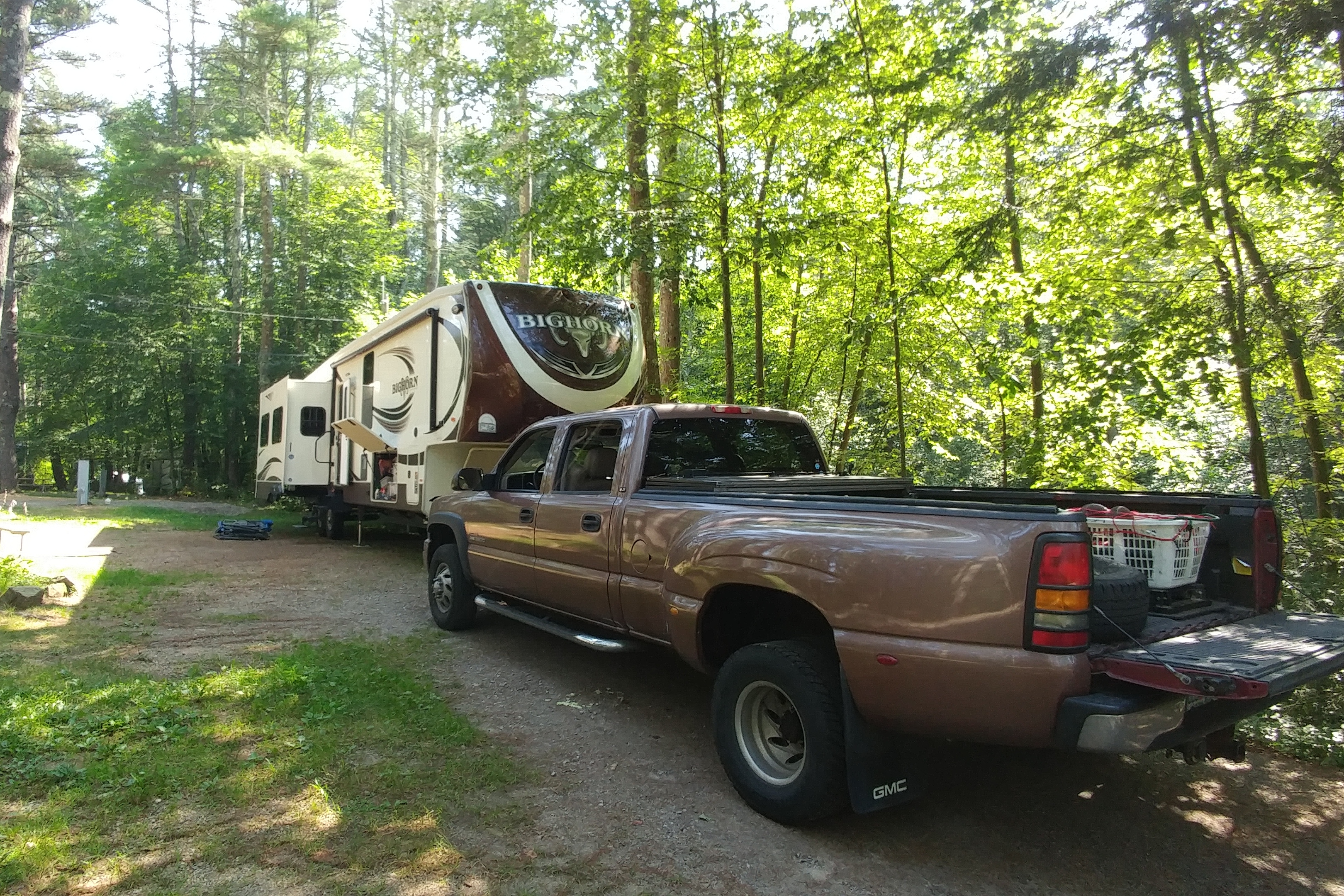 We loved our site. It wasn’t exactly level, which created some stability problems for us, but it was tolerable. The site had a wide expanse of green area on the right and woods on the left. Our only neighbors were a seasonal family below us to the left and occasional transient campers behind us. It was very private with plenty of parking space.