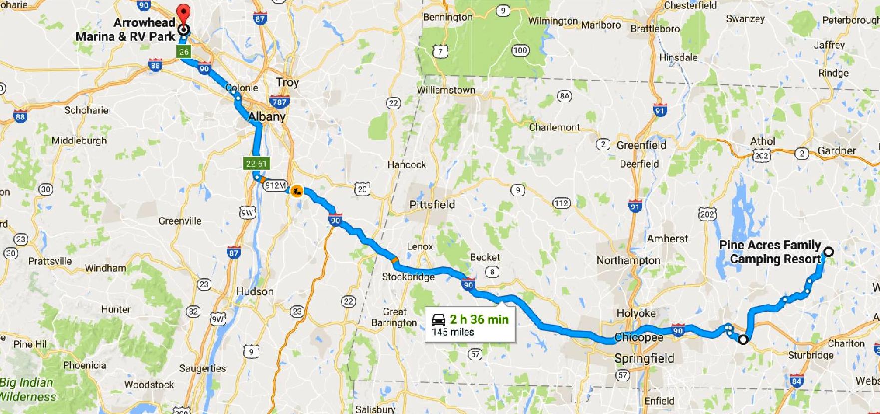 We were sad to leave Massachusetts. We had a very fine couple of months with family and friends. But we weren’t too sad to leave Pine Acres Family Campground, our home for the past 2 weeks. It is a fine place, but probably not the best place for us. The things that make the campground exceptional – the kid activities, the swimming pool, the lake, the ice cream shop, the boat rentals – were things we used very little or not at all. It is a great place for families with younger children. Not nearly as great for us.The one thing that defines Pine Acres: kids on bikes. Hundreds of them. Everywhere. They ride around the campground during all daylight hours, some going very fast, others still using training wheels. Drivers do a good job of sharing the road with them, but after two weeks it was a relief to get back on the open road. There is a BMX track for the more adventurous bicyclists, but it is a poor second to Normandy Farms’.