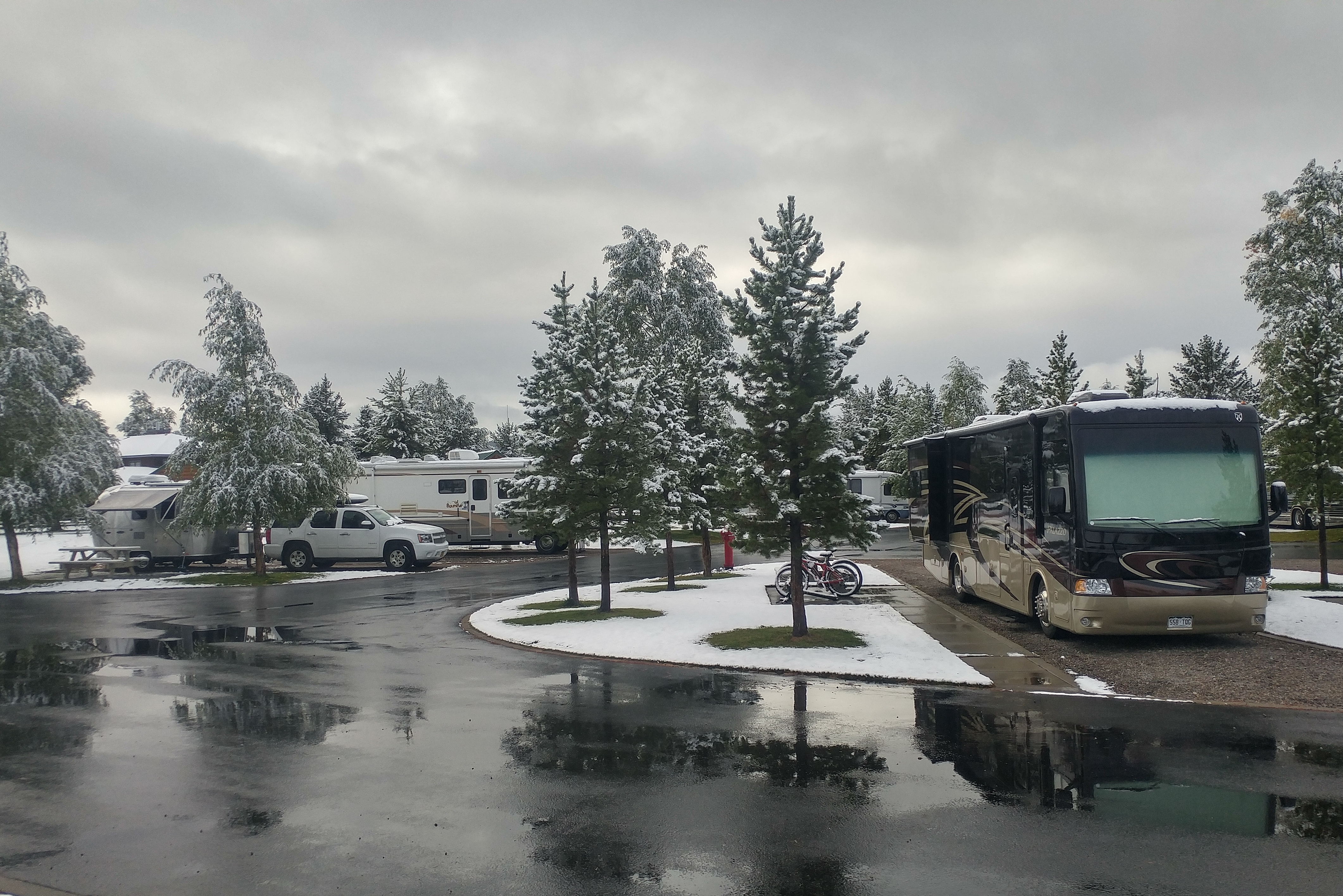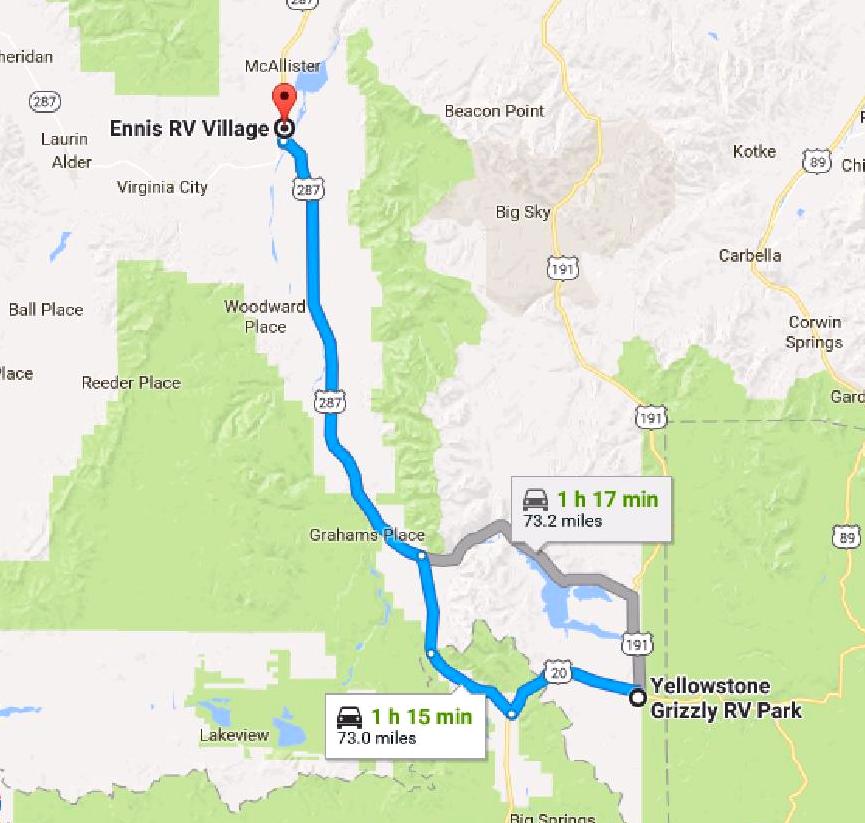 More than any other hop, this one felt like an emergency. It snowed 2″ last night, with the temperature dropping to 30 degrees. The forecast for tonight in West Yellowstone is for a low around 25 degrees – cold enough to freeze the water line. We felt some urgency to get to a lower elevation. By going 73 miles to Ennis MT we dropped from 6800 feet to 4900 feet. Just enough to get below the snow. Just enough to stay above freezing.