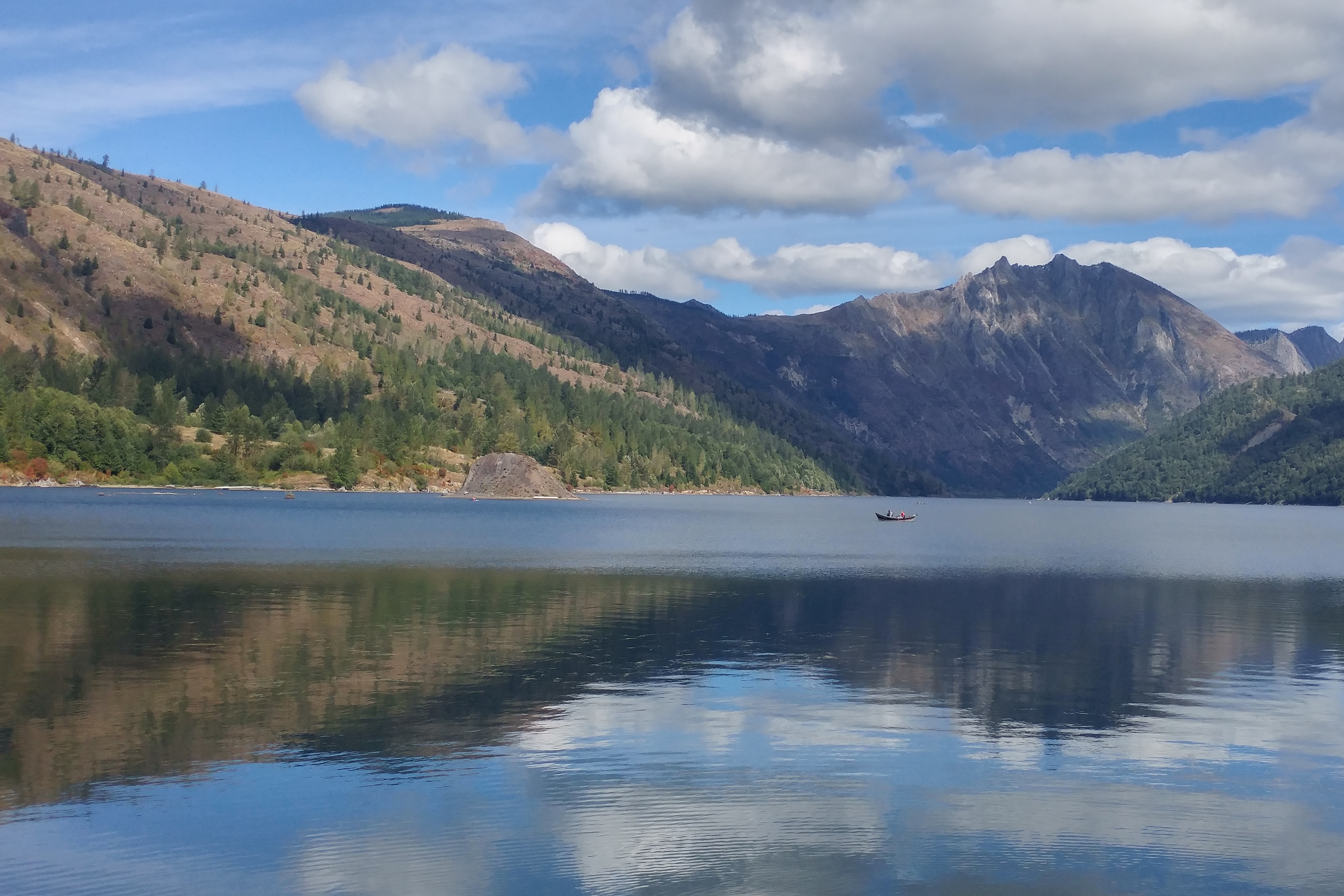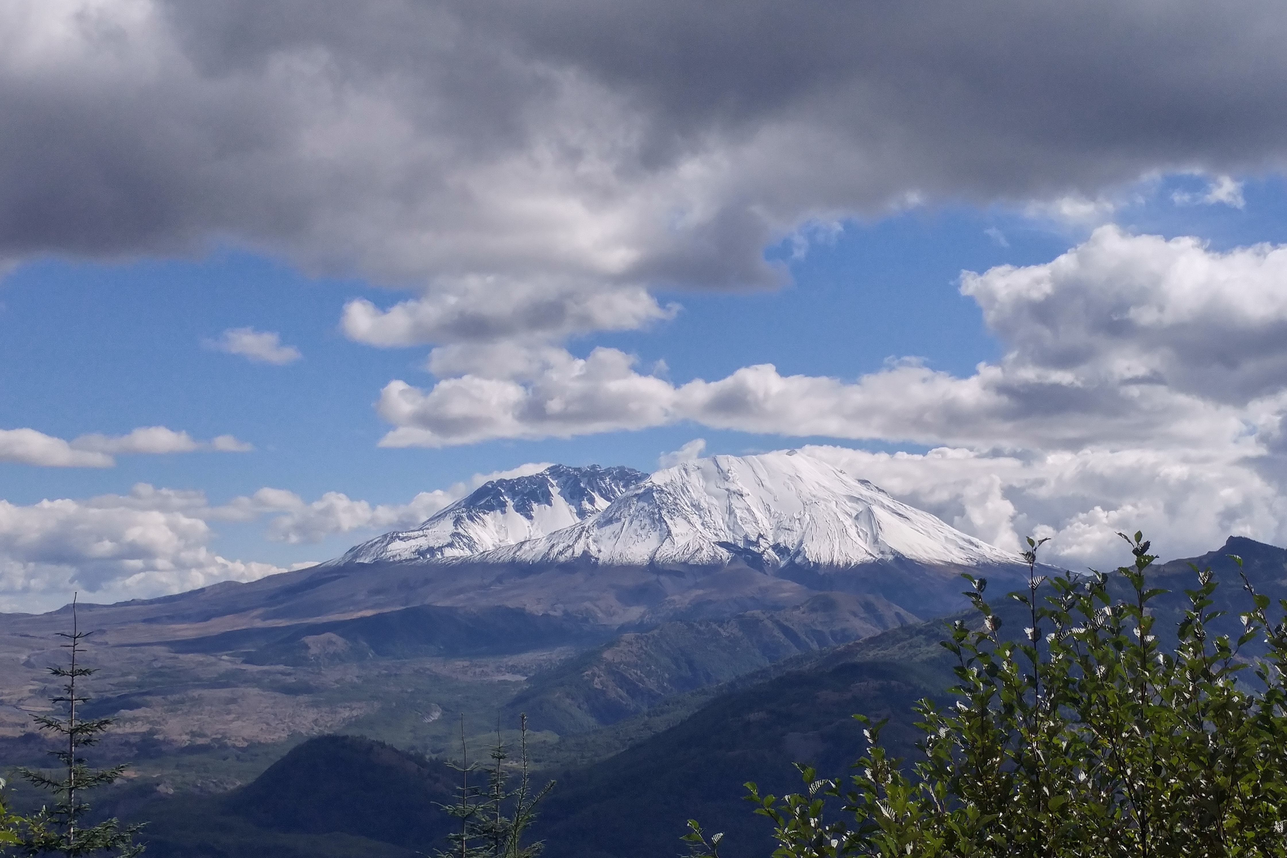 So I was curious to see what the area looked like after some 35 years of recovery. Well, the change is remarkable. The mountainsides are densely covered with evergreens. Not a flattened tree in sight. The snow-capped mountain is still beautiful, if ominous.