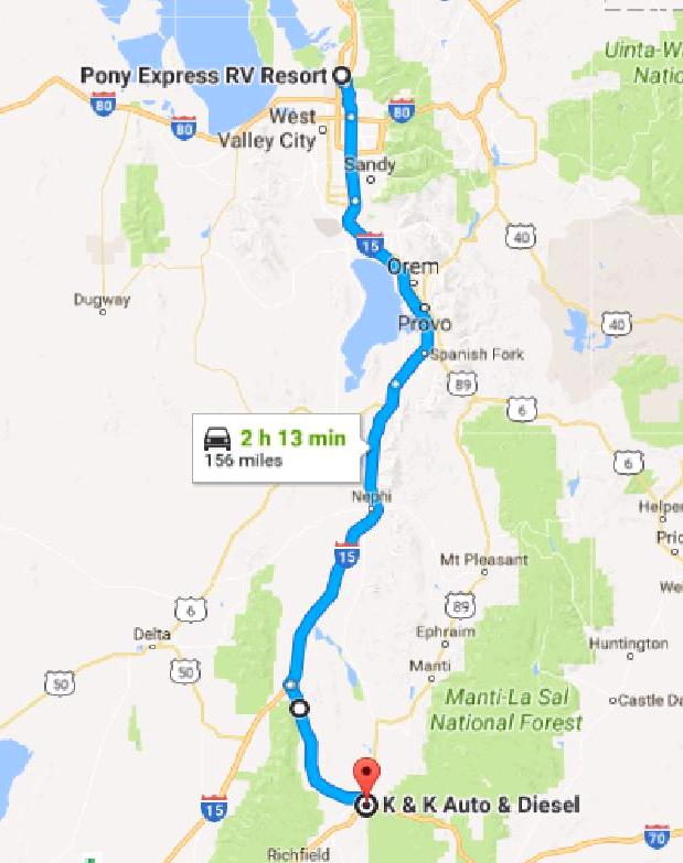 This was not the hop that I planned because the truck failed us when we got to Salina. Everything was fine until I got to a stop sign where UT 50 took a left into town. Stepped on the gas… nothing. Just some funny noises from the engine. It was still running but no power whatsoever. I looked at the dashboard and, sure enough, the “check engine” light was on. Shades of Stony Brook VA where we had a problem with the electrical connection to injector #7 about 2 years ago. I shut off the engine for a minute, restarted it and had enough power to complete the left turn and get into a service station. The attendant there gave me a number to call. Got a guy who told me to take the rig to K&K Auto Service about a mile away. Drove the rig there and found a guy who diagnosed the problem – injector #2 – but was unable to fix it (not a diesel guy). He reset the code and we tried to move on, but the problem recurred immediately.