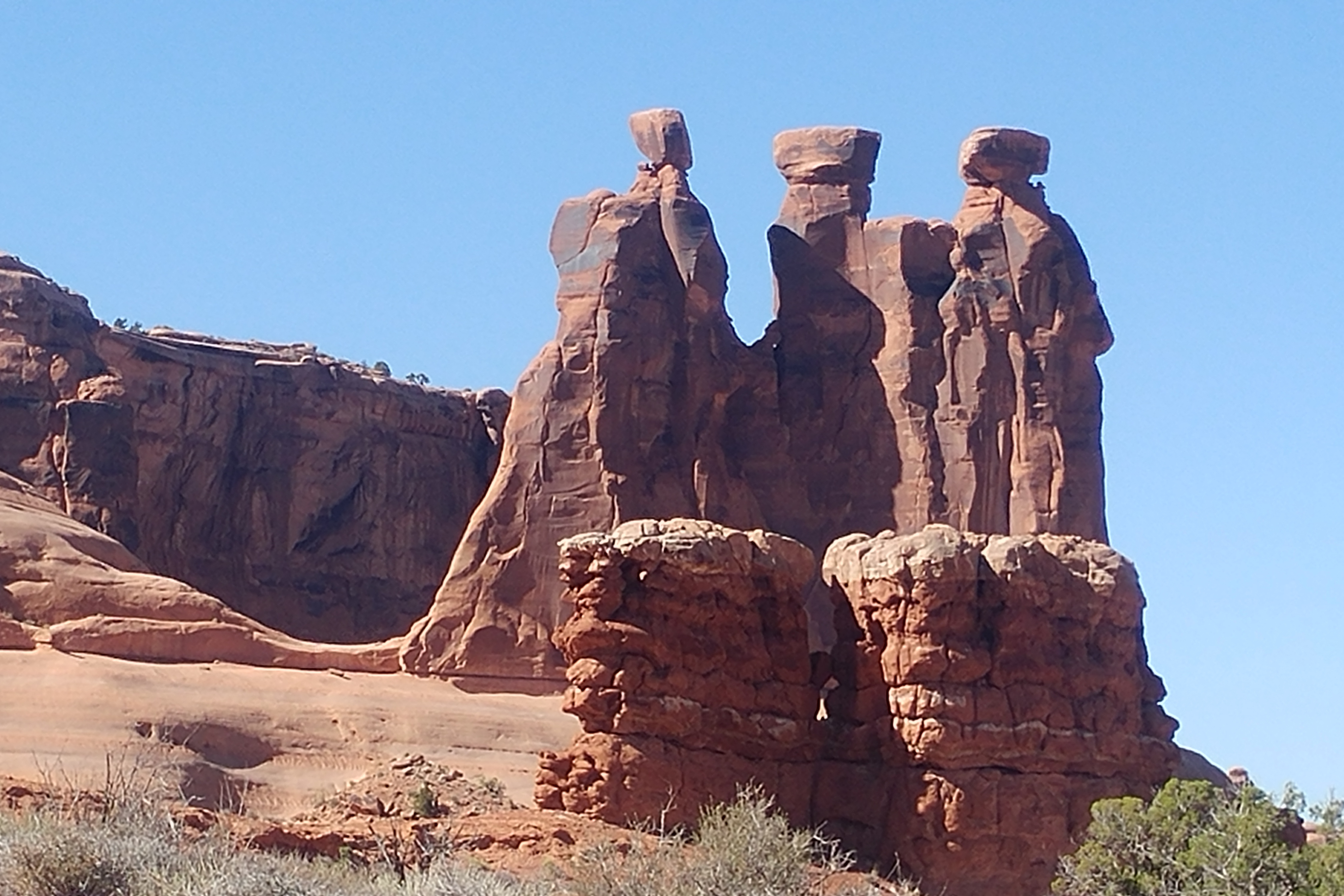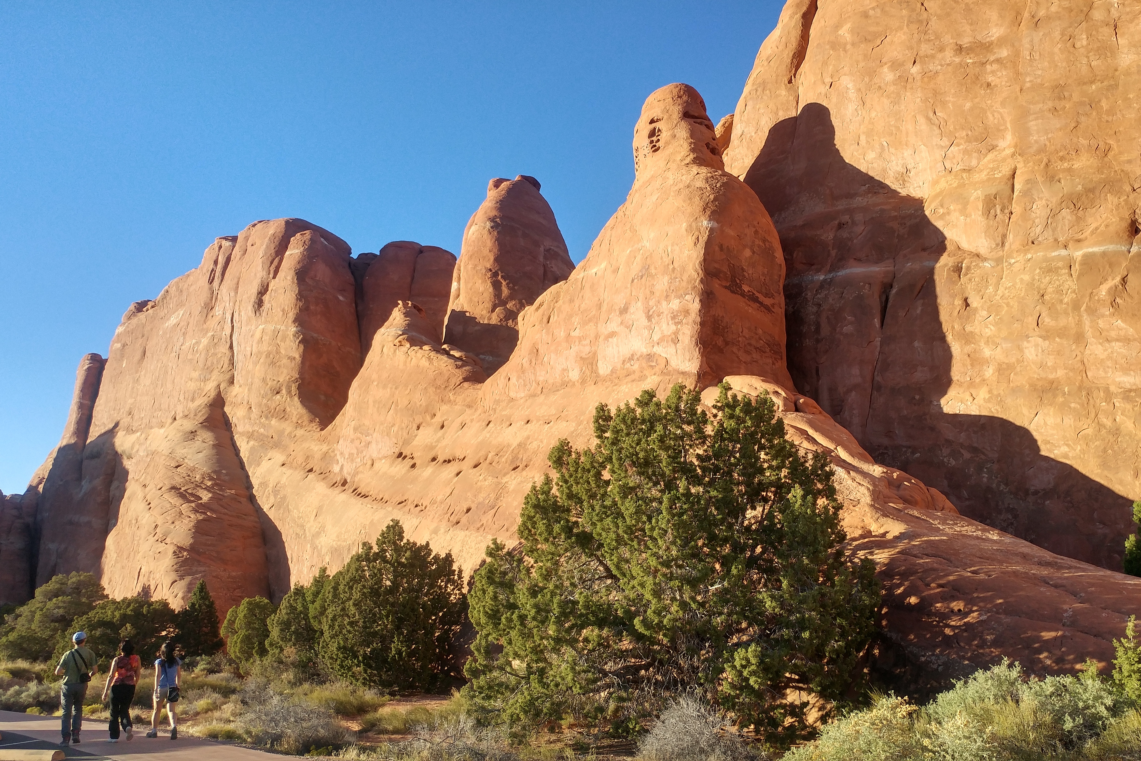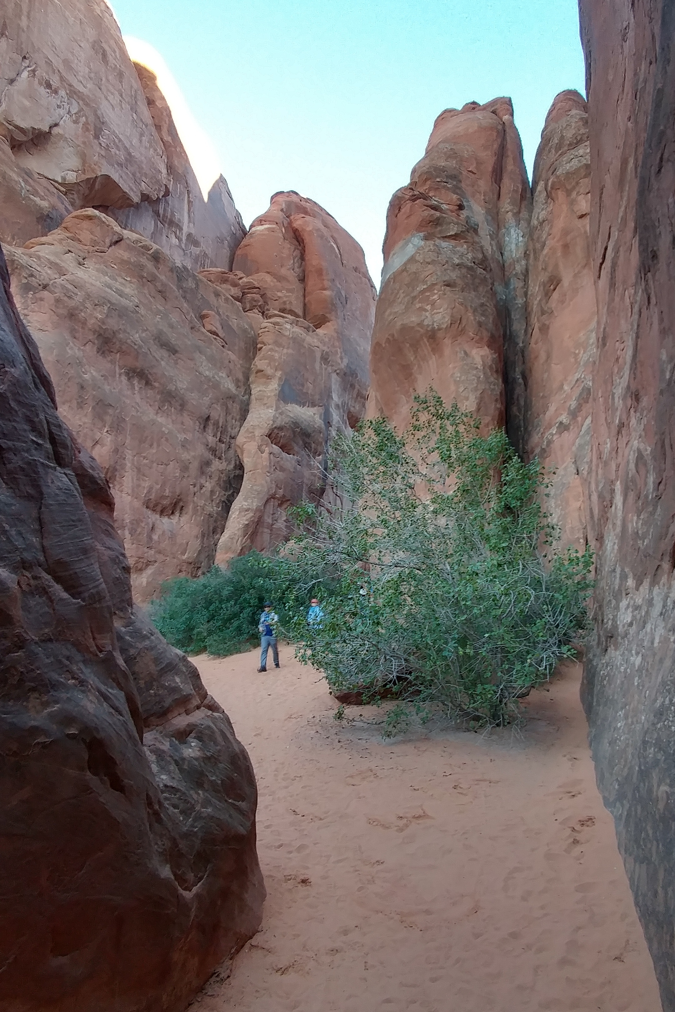 Many of the arches require a walk to get close. Jett wasn’t interested in any hikes and I was pressed for time on Thursday, so I only did two hikes. The first was about a half mile up to a promontory, to view the Delicate Arch. I found that view disappointing and probably not worth the effort. The second hike was about a quarter mile, into a chasm containing the Sand Dune Arch. That hike was eerie and definitely worth the effort. But I found myself wishing I could find a time when the lighting was better. But with the chasm being as deep as it is, there may never be a time when it gets direct sunlight.