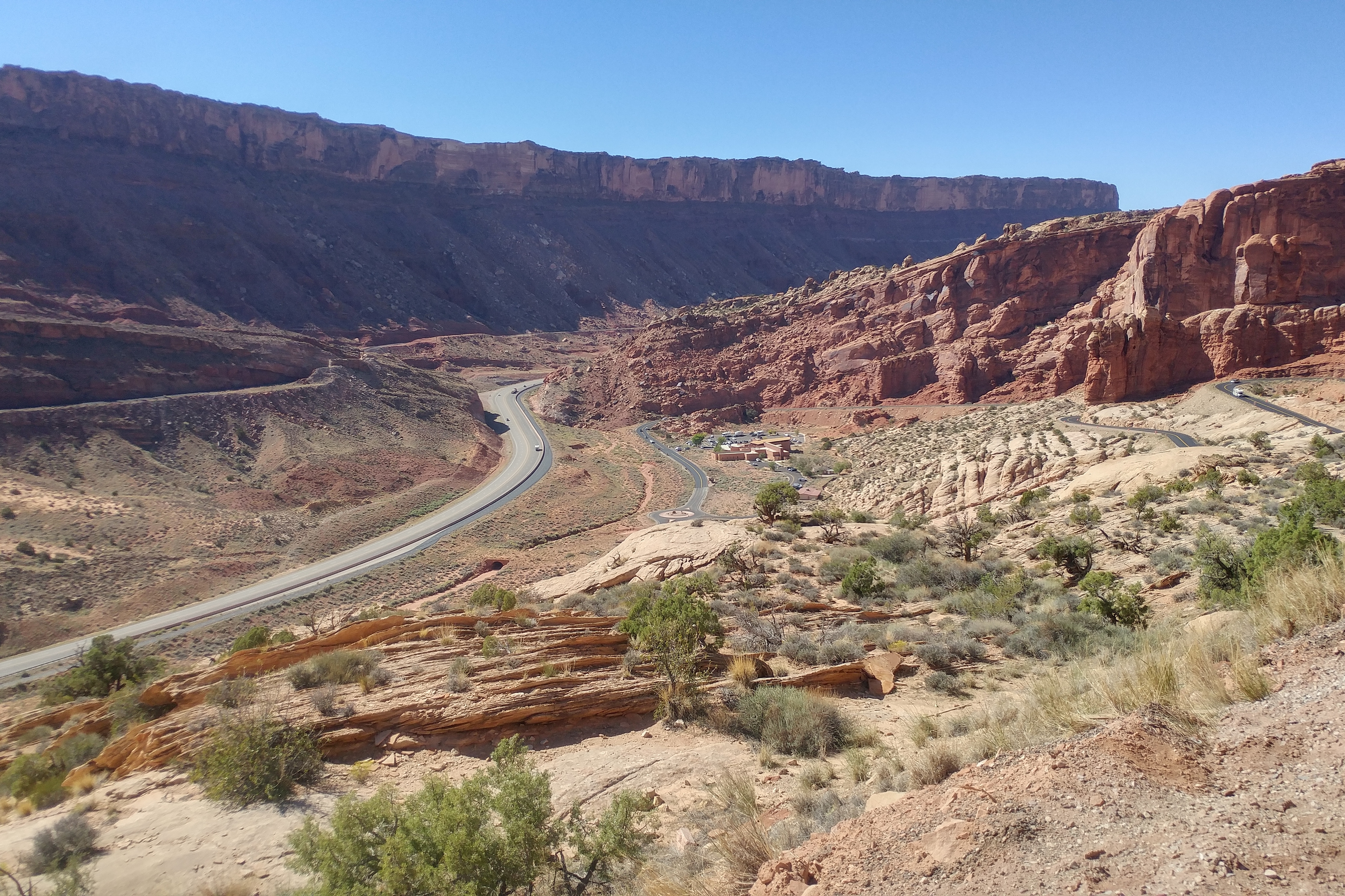 The entrance to the park is flat, but it immediately transitions into a climb up the side of a cliff. In less than a mile the road rises over 500 feet, producing a panoramic view of the Moab Valley. From there it flattens out and the rest of the 18 mile ride is relatively flat and easy, with just one additional drop – maybe 200 feet – into a valley.