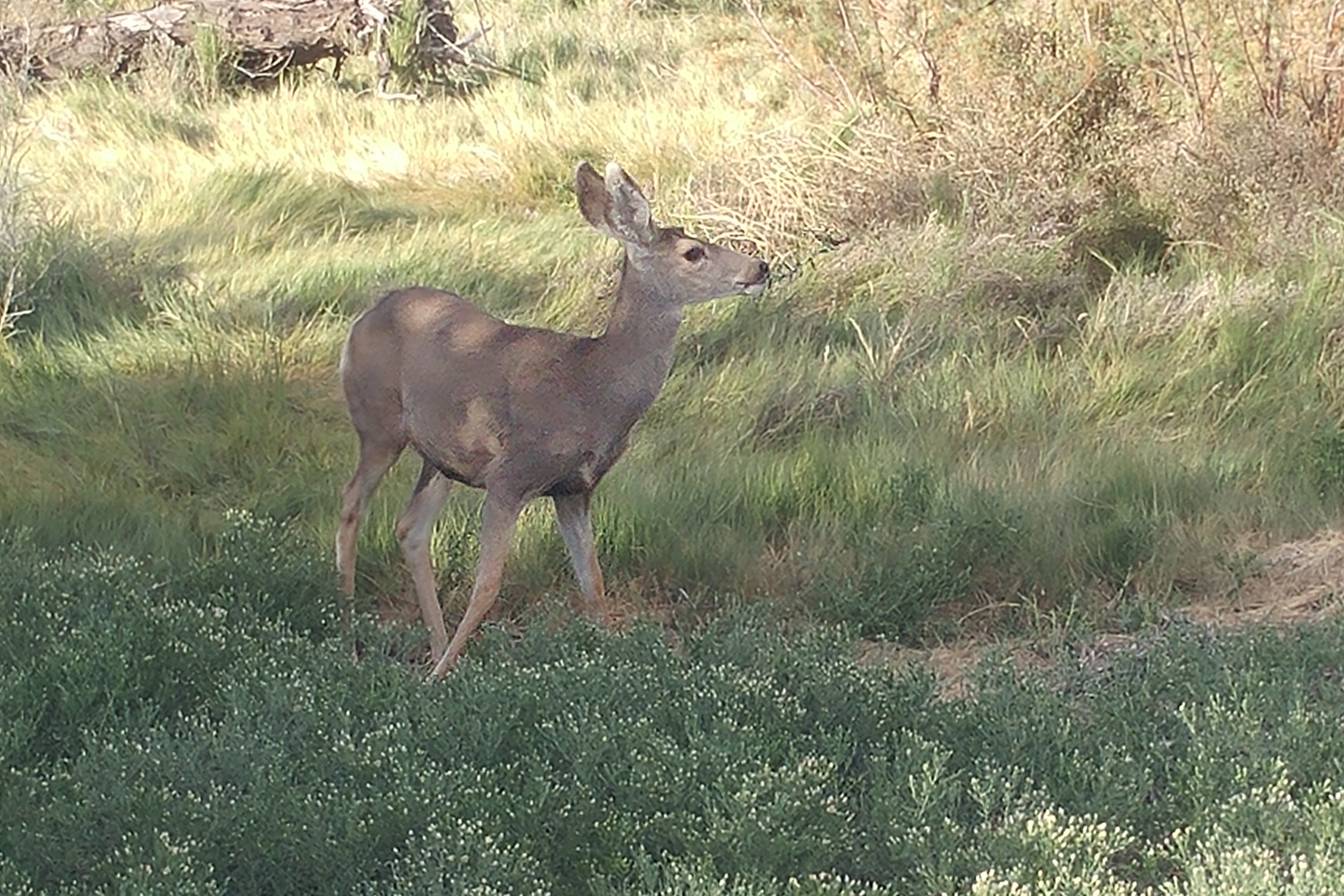 The other feature of the stay in Moab was Moab itself. The Colorado River canyon on the edge of Moab was very beautiful. And the RV park had mule deer that weren’t intimidated by our presence. Rusty and I encountered them twice. Rusty was very interested but, surprisingly, did not bark at them.