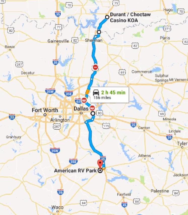 This was another hop that didn’t exactly go as planned. I intended to take a route that used US 69 instead of US 75 because we had had enough of 75 and didn’t like it very much. But after we exited onto US 69 and passed through Denison TX, we missed a turn and ended up back on US 75. We stopped at a truck stop to get our bearings and decided that it would be best to take US 75 down to the outskirts of Dallas, then use I-635 to go around rather than through. We picked up I-45 south of Dallas and it was pretty simple from there.