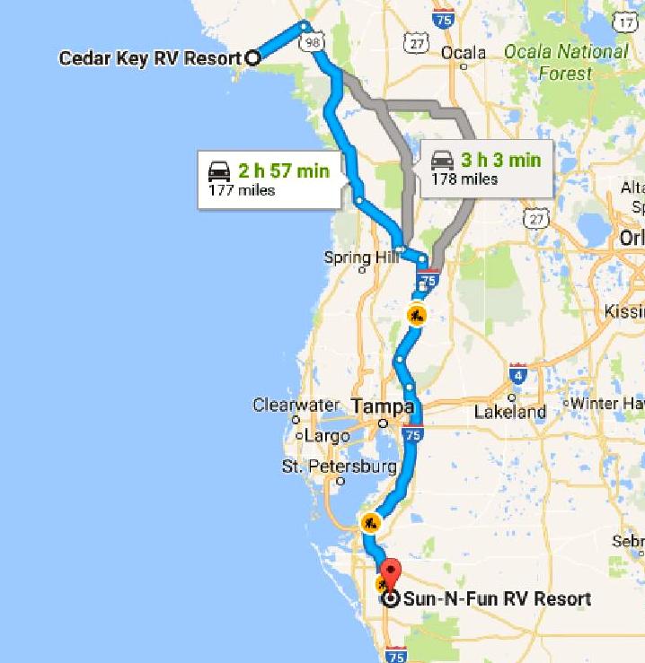 184 miles via FL 24, US 98, I-75 and FL 780. Cumulative tow miles: 1484. Truck miles: 205. Cumulative truck miles: 1975.