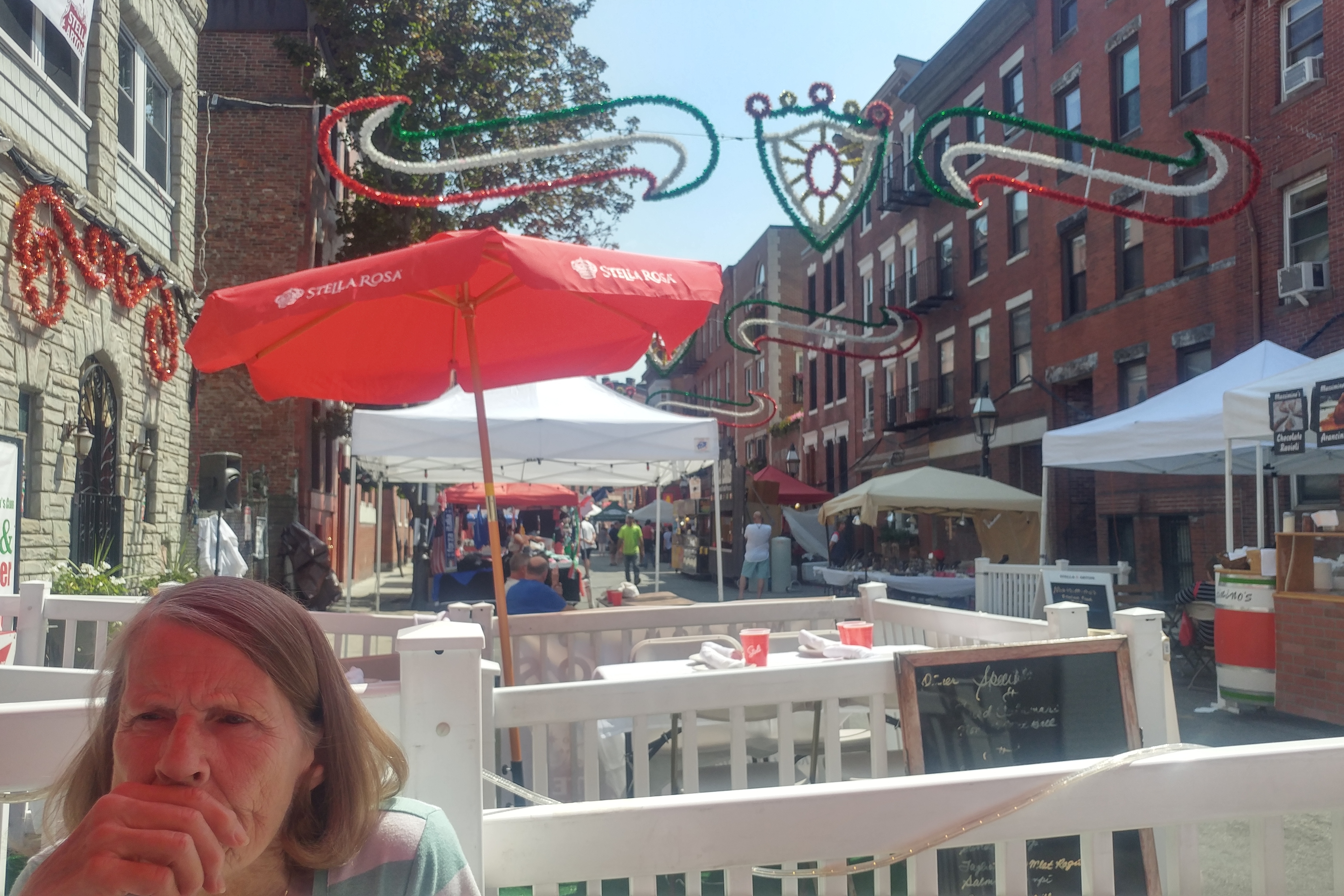 The foodstuff that we most crave when we go to St Anthony’s is fried artichoke hearts. We just love a good, freshly fried artichoke heart. This year we could not find any for sale at the street vendors, so we decided to have a light lunch at Massamino’s restaurant. We ordered the fried artichokes as an appetizer (excellent!) and split a chicken piccata entrée (the best I have ever had). We dined al fresco and watched the fair traffic as we dined. It was a very nice lunch.
