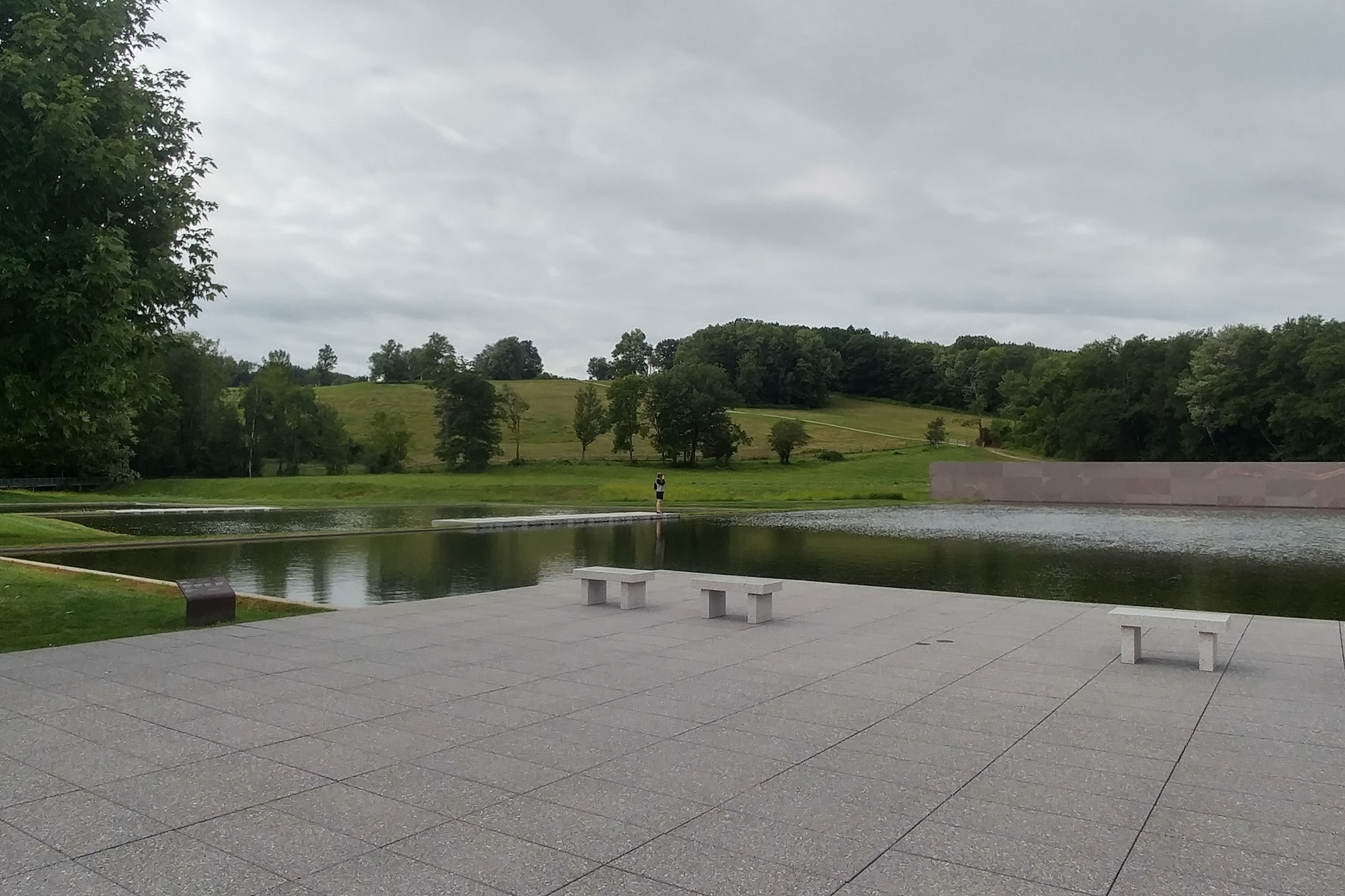 Parking is free and the lot is not too tight, so I had no problem fitting The Beast into a slot, ably assisted by a few high-school students doing their summer job. Admission was $20 (no discount for my senior status). The grounds are expansive, with many miles of walking and biking trails (which I didn’t sample). The entrance is via the Clark Center, a building which houses special exhibits, the gift shop and the cafeteria. It is connected by an enclosed walkway to the museum, which was my main destination. There is also a Lunder Center, a building which I did not visit that seems to house research and academic facilities. Near the gift shop is an outdoor plaza with a reflecting pool and a bucolic view of the rolling hills that surround the complex. I was there on a cloudy day, so the photos I took probably don’t show the outdoor area in its best light.