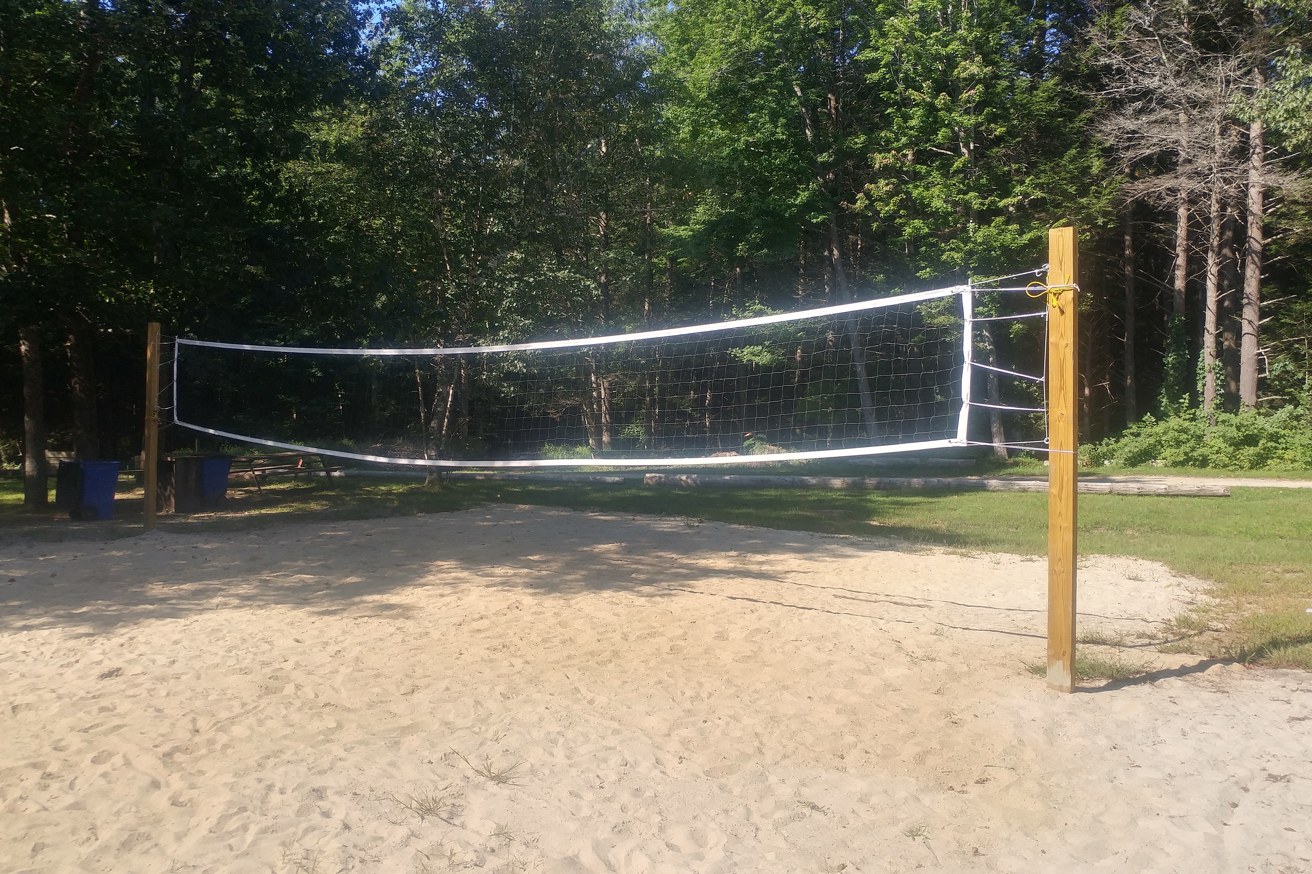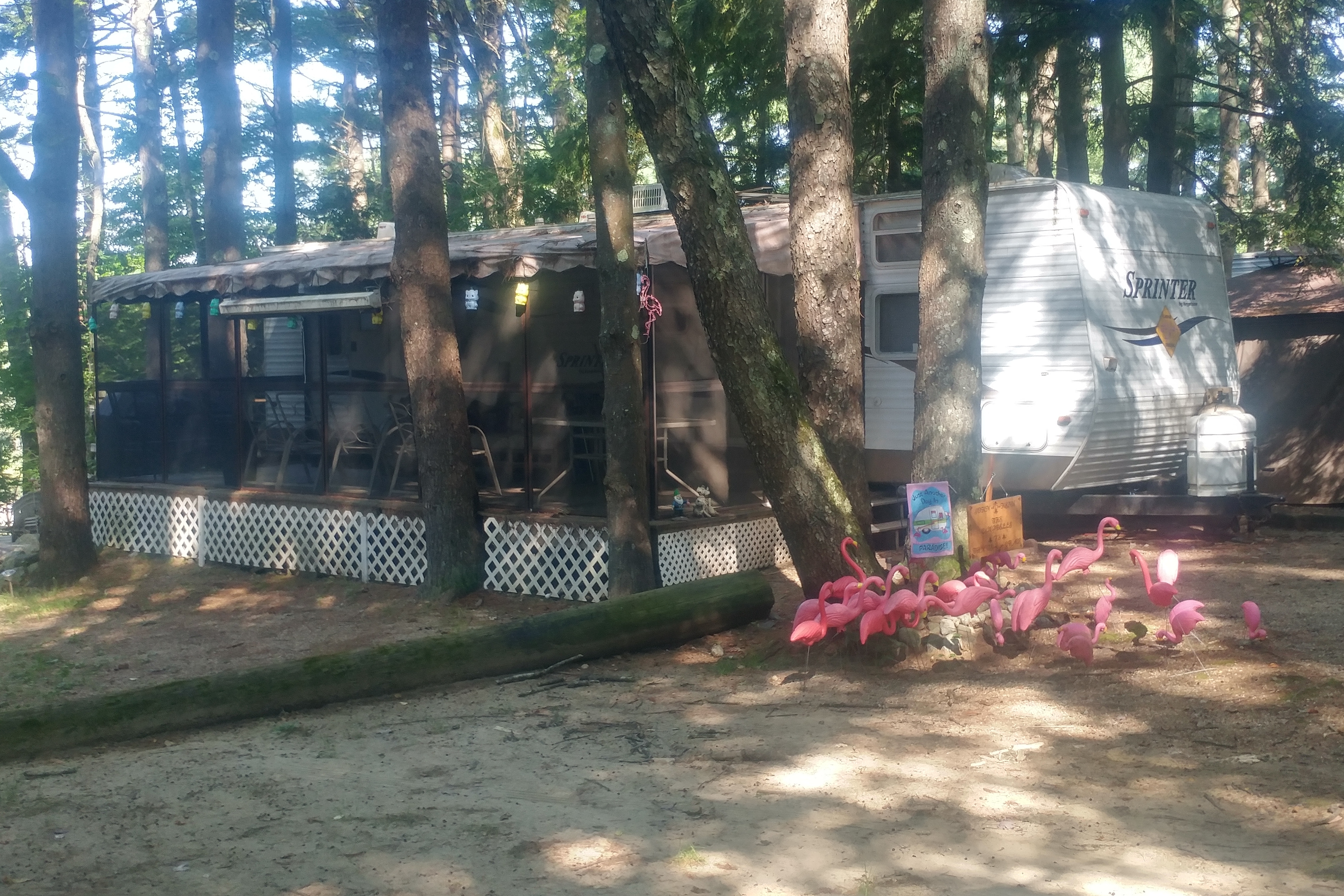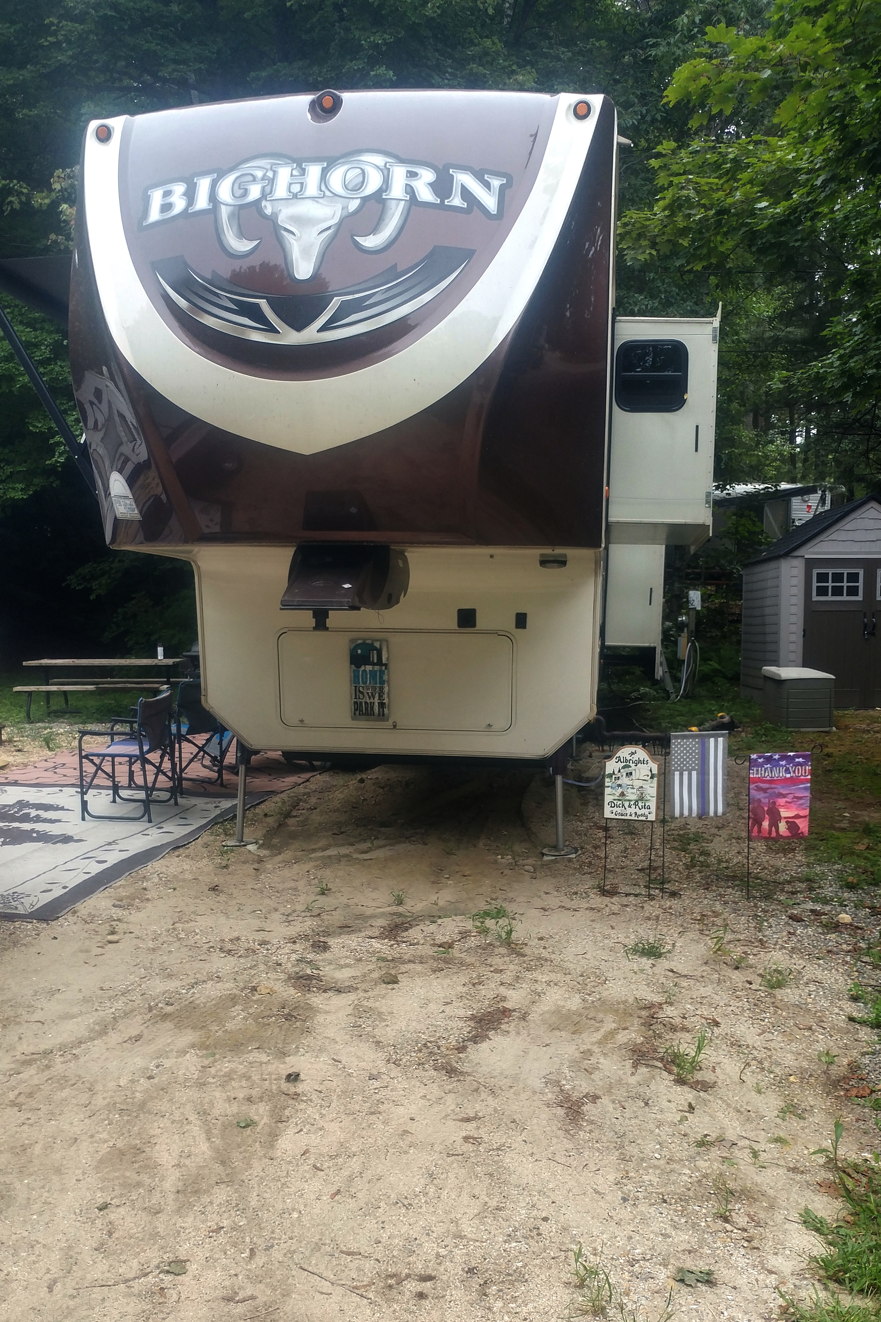 The biggest problem with the site: the sand. Apparently a tree was removed before we arrived, which left a hole in the ground. The hole was filled and then the entire site was covered in sand. Not gravel, like many other sites, but sand. We had great difficulty getting the RV positioned because it sank into the sand. It was like parking the RV on the beach. Worse, the sand is tracked into the RV every time we enter. We have swept about a bushel of sand out of the RV this summer. Not pleasant at all.We put down a second outdoor carpet and that helped, but it hasn’t eliminated the problem. We have already told the office staff that if we return next year we will want gravel put over the sand.