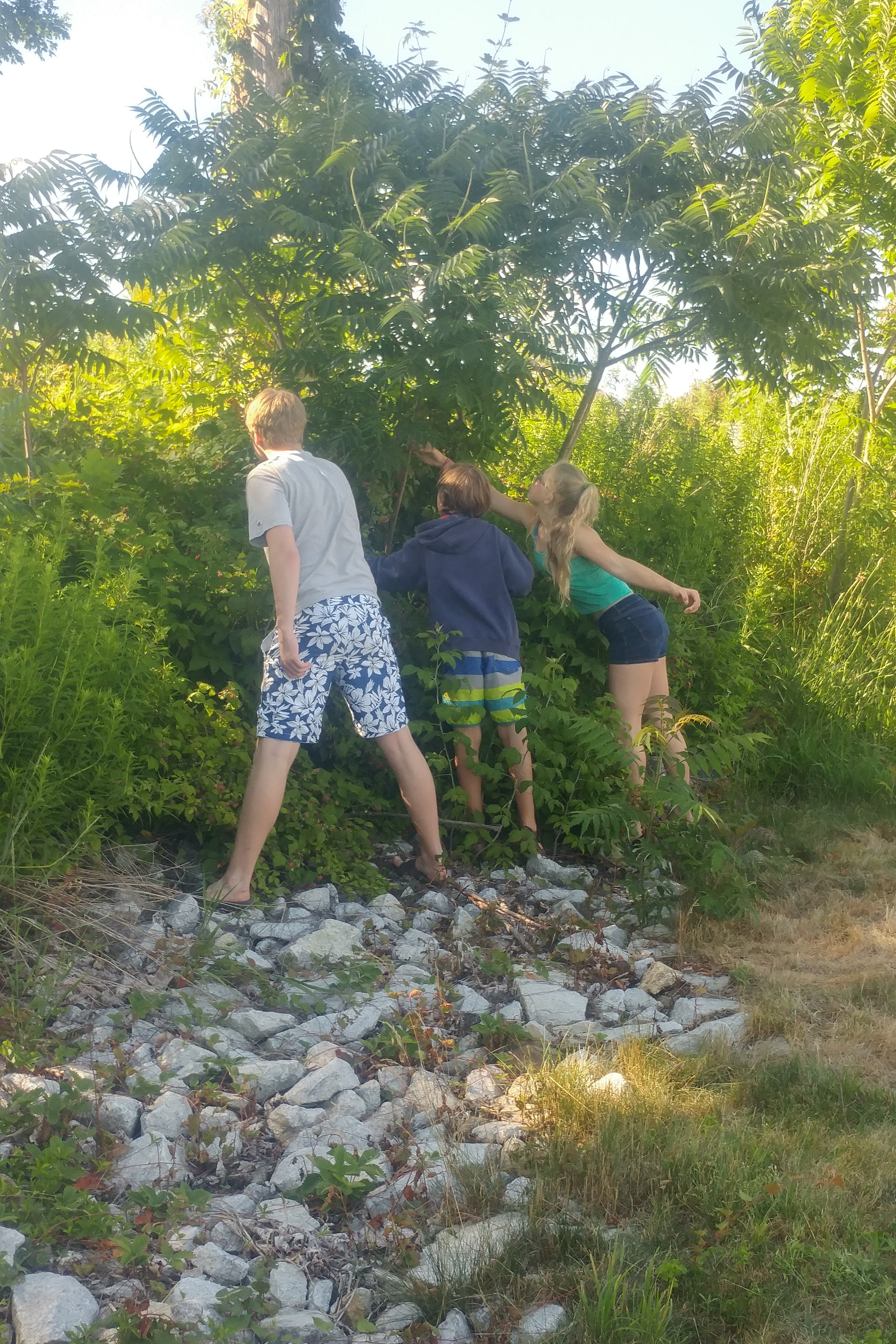 The second was a mid-summer visit with Rusty and Ray and Kim’s three neighbor kids, Connor, Riley and Levi. We walked the connecting road with Rusty leading the way. They went into the store and spent some money on fudge, to which they gave high marks. They also enjoyed the animals in the livestock pen – lots of goats plus a few ponies and steers. Finding and eating wild raspberries on the way home was a bonus.
