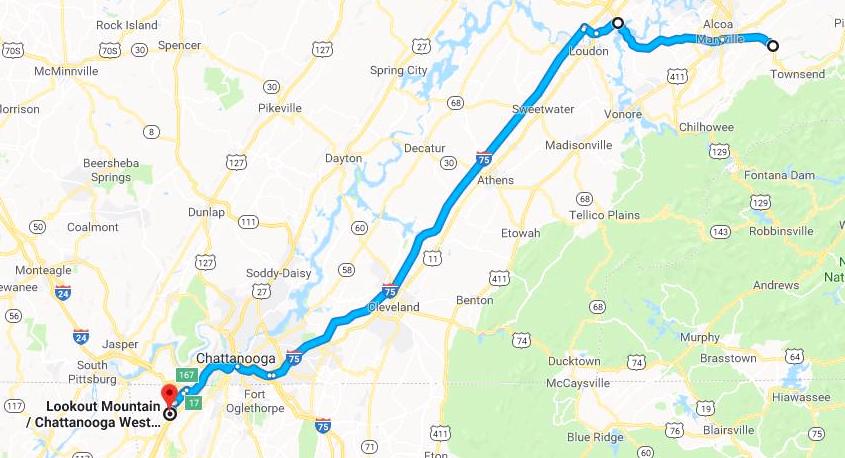 134 miles via US 321, US 11, I-75, I-24, I-59 and local roads with a rest stop at the halfway point. Cumulative tow miles: 271. Truck miles: 189. Cumulative truck miles: 542. The extra truck miles were incurred primarily in our trip out to Tellico Village to visit with friends Roy and Patricia.