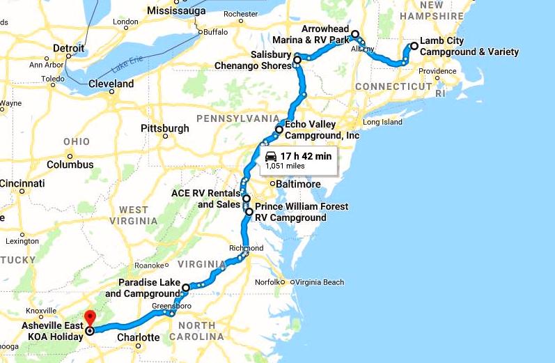 We had to cancel all of the Segment 1 reservations when we got stuck in Chenango Shores and when we tried to rebook Mama Gertie’s near Asheville, they had no room. We found a spot at the Asheville East KOA.