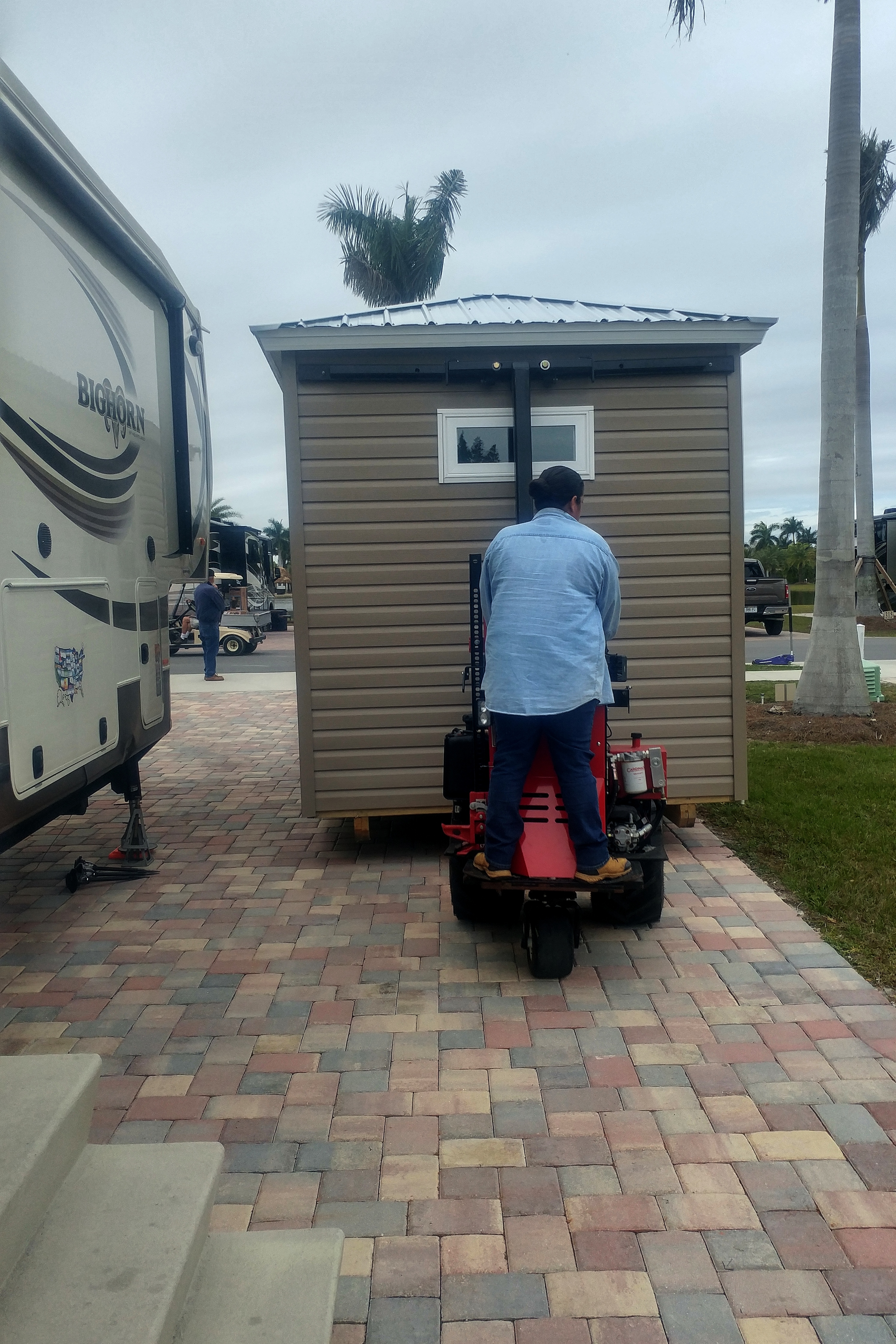 The next adventure was getting the shed dropped without crushing the water and sewer lines. It was a close shave, but the forklift driver – a woman – maneuvered with the skill of a surgeon.