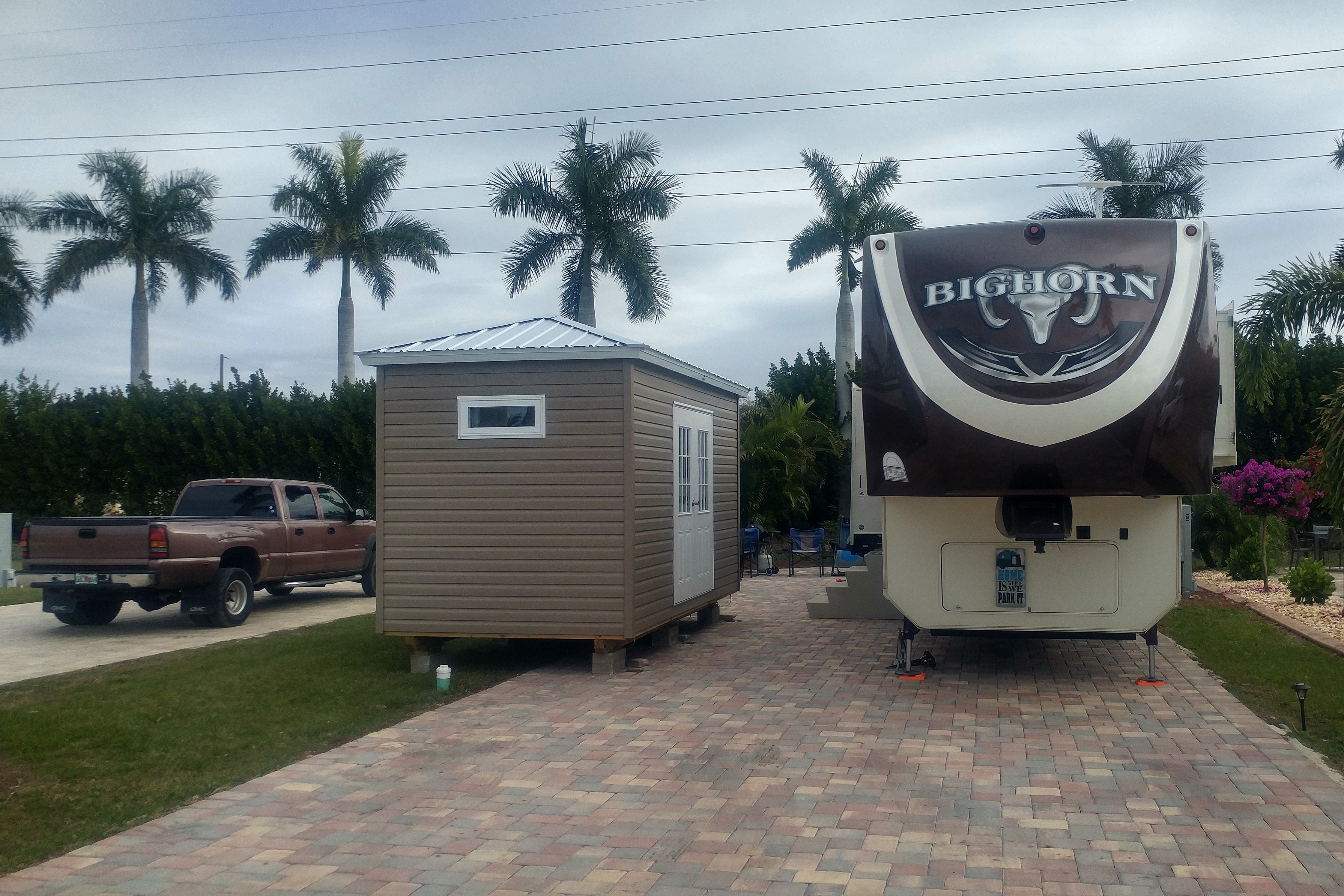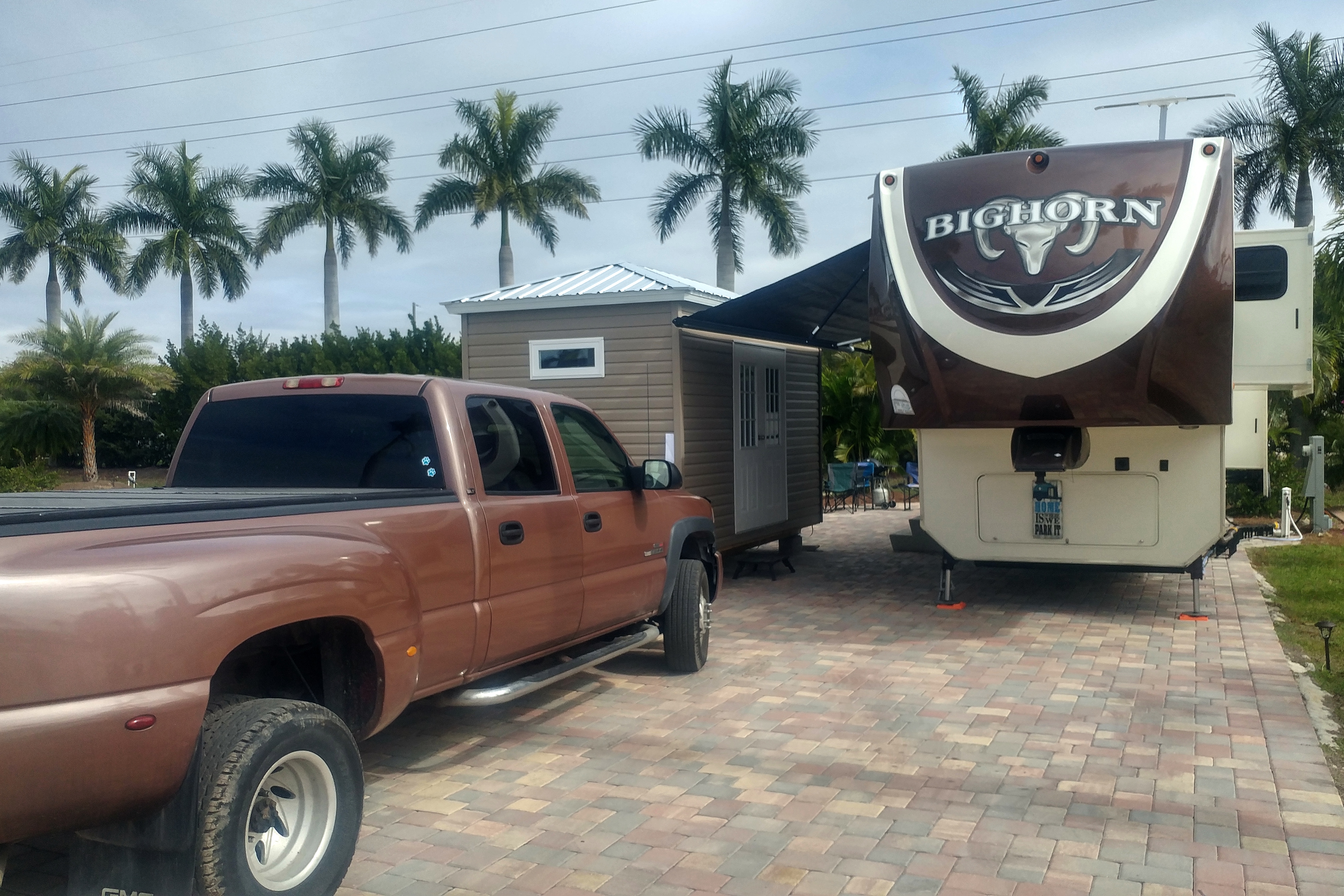 When I had first selected the site for the shed I had eyeballed the RV awning and was convinced that it would be able to fully deploy without touching the shed. But after shifting the shed 4 inches closer to the RV, I was no longer so confident. After getting the shed tied down, I apprehensively put the awning out. Gingerly, inch by inch. It finished deploying with about 3 inches to spare. And was above the top of the shed doors – a factor that I had not considered and feel damn lucky that it worked out.