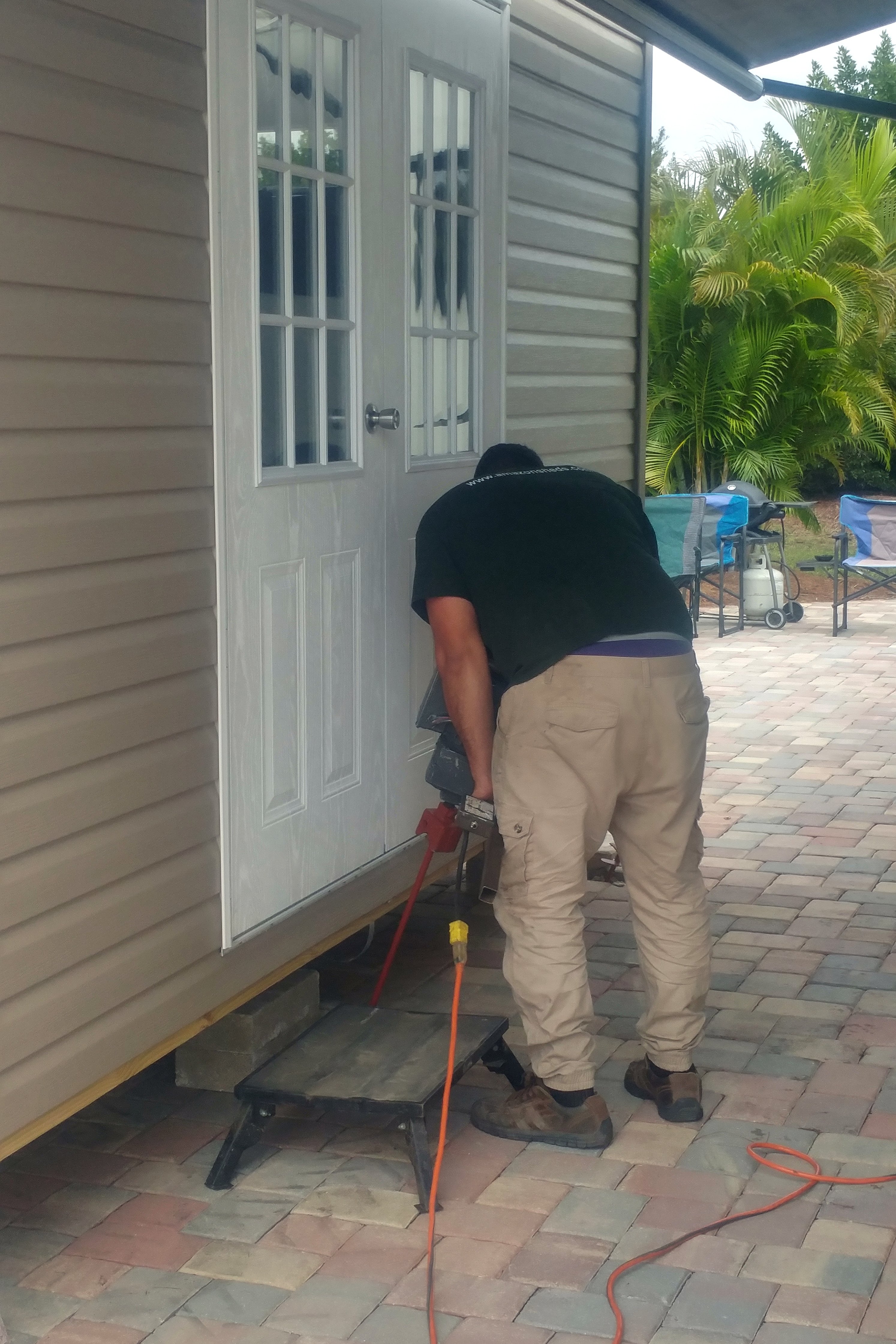 I was fascinated by the installation of the hurricane tie-downs. These were 6 metal rods, with auger tips, that were drilled into the soil (after removing some pavers on the south edge) using a super-sized version of an electric drill. It obviously had tremendous torque. After the rods were in place, metal straps were screwed into the rods and attached to the underside of the shed. Supposedly these will keep the shed from flying off to Kansas in the next hurricane.