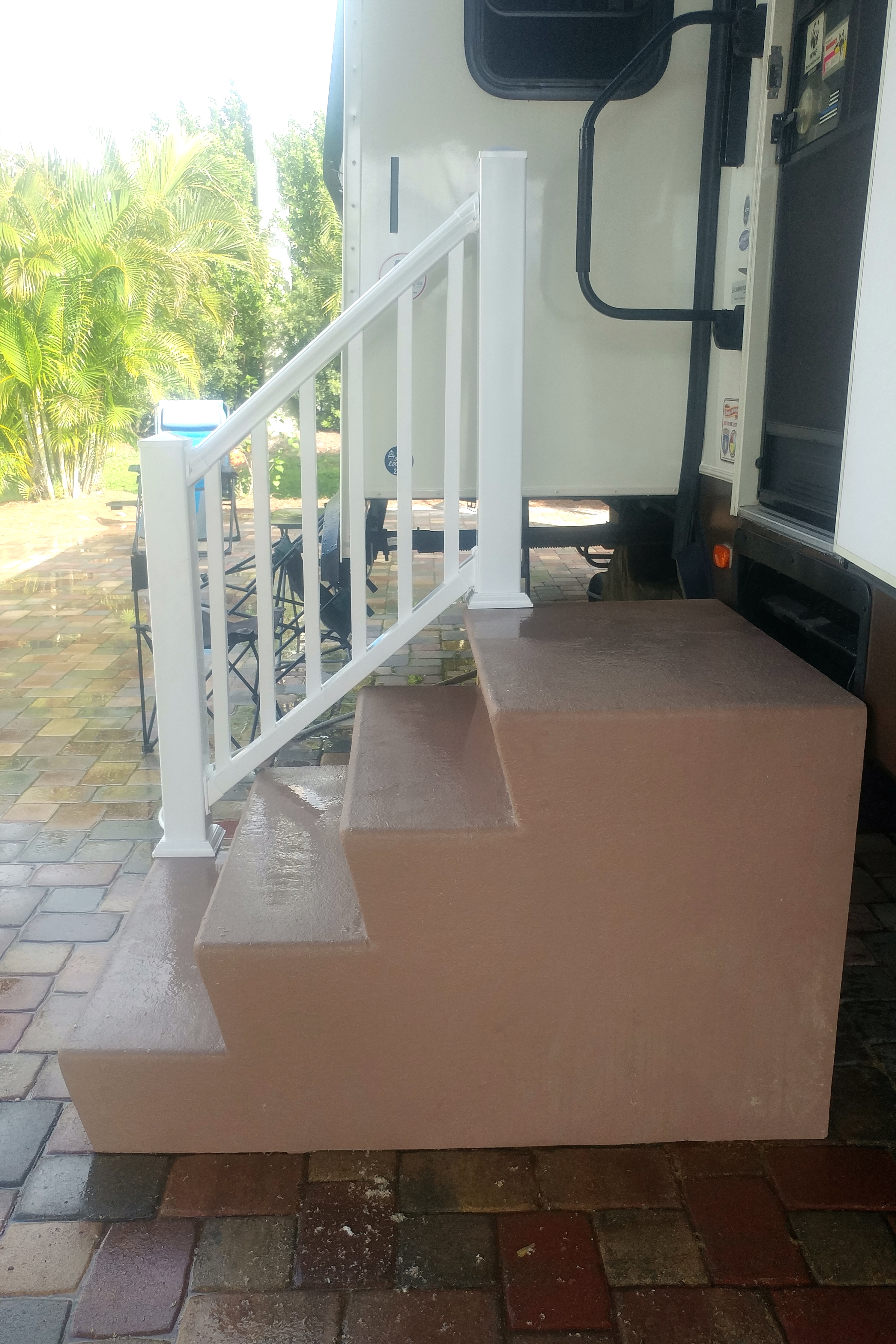 Of course we had to paint the steps, too. No sense in putting a nice PVC handrail on a crappy-looking set of steps. So I painted them beige, to match the RV, more or less.
