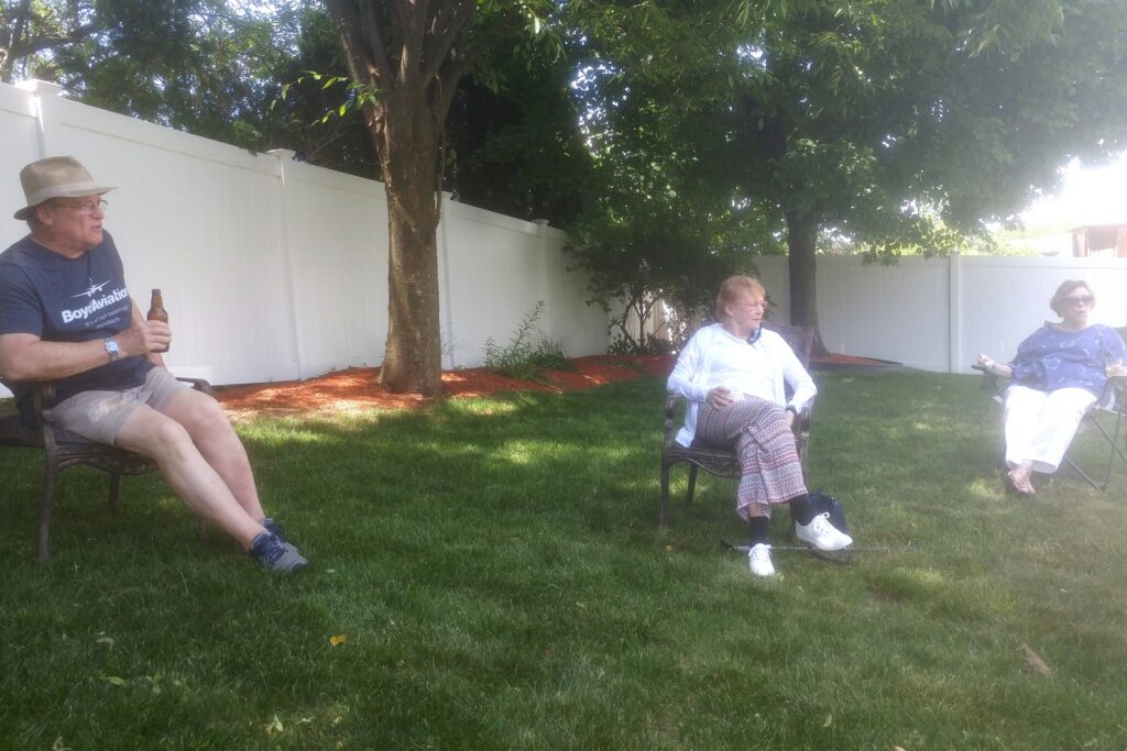 Jett was able to see her 3 siblings yesterday in a CDC-approved fashion. We traveled to her brother Ray’s house, settled in their back yard and sisters Sybil and Christine joined us, sitting in widely-spaced chairs. We chatted, loudly, across the distance.