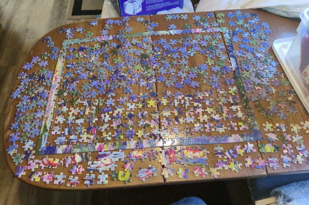 Freedom to use “her” space. The RV has a bath-and-a-half. The full bath was hers, except when I needed to shower and shave in the morning. The half bath was mine. Now I have full use of the full bath and rarely use the half bath. Similarly, the dining room table was hers, used to keep piles of papers, periodicals and “to do” tasks. Now it is mine and I am using it right now to do a jigsaw puzzle.