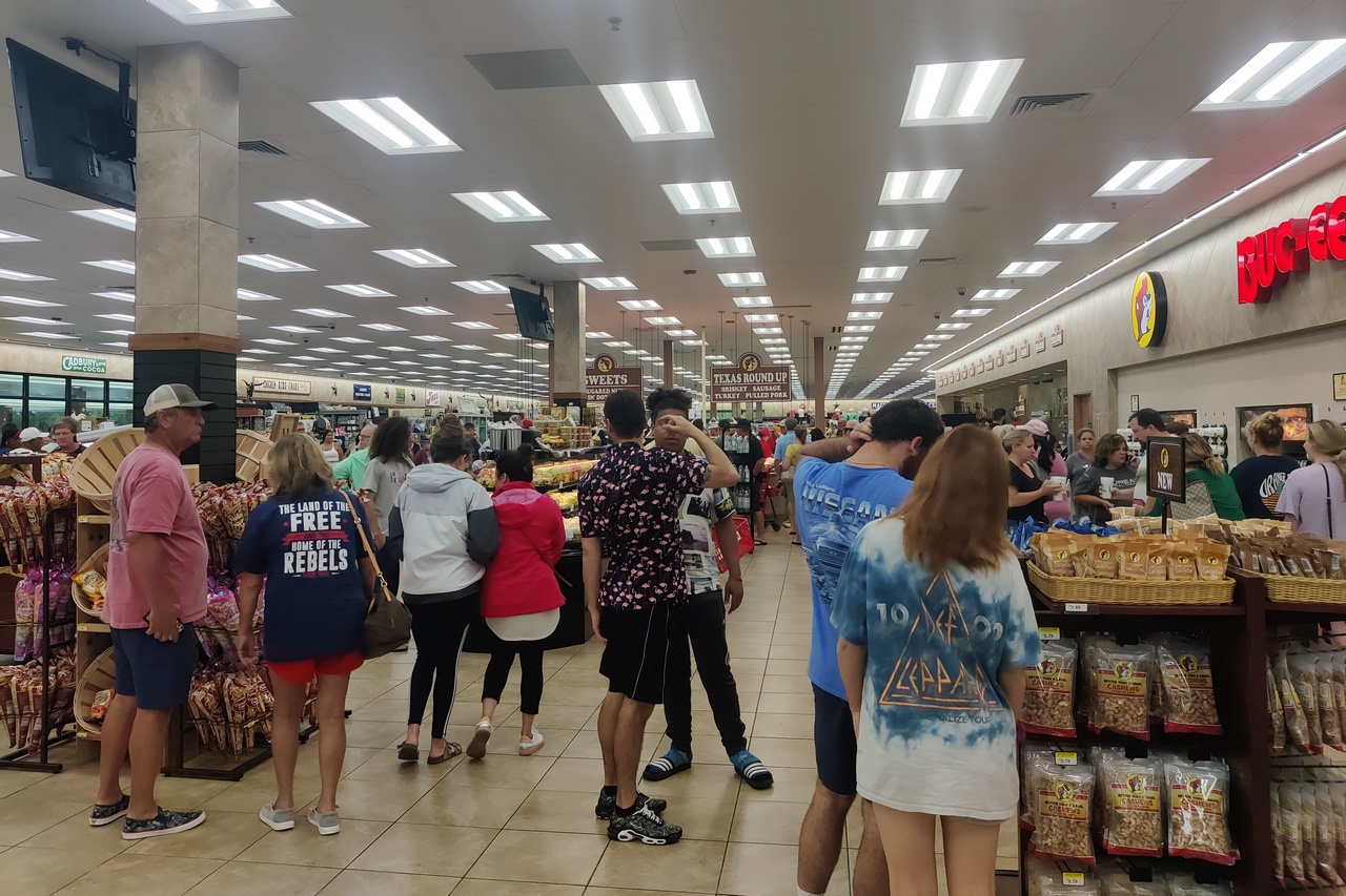 This was a simple hop in terms of navigation: get on I-10 west, go until I-12 split off, go to the end of I-12 and rejoin I-10 then take the exit for the hotel in Port Allen. But the weather was miserable: driving rain for about two-thirds of the trip. Fortunately the rain let up before we arrived at the destination so we had dry weather to unload the car. We did take a couple of breaks to stretch our legs and relieve our bladders, plus lunch and refueling at Buc-ee’s in Robertsdale AL. Last year, on my first encounter with Buc-ee’s, I arrived late at night and the place was virtually deserted. This time we arrived shortly after noon on a day when I-10 had a major backup and hundreds of people decided to wait it out at Buc-ee’s. It was a madhouse. But we got a sandwich to share and ate it in the car while we waited for the I-10 jam to clear and space at the 64 gas pumps to open up.