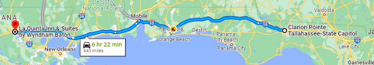 443 miles, almost entirely on I-10, except for I-12 north of New Orleans. Cumulative miles: 821.