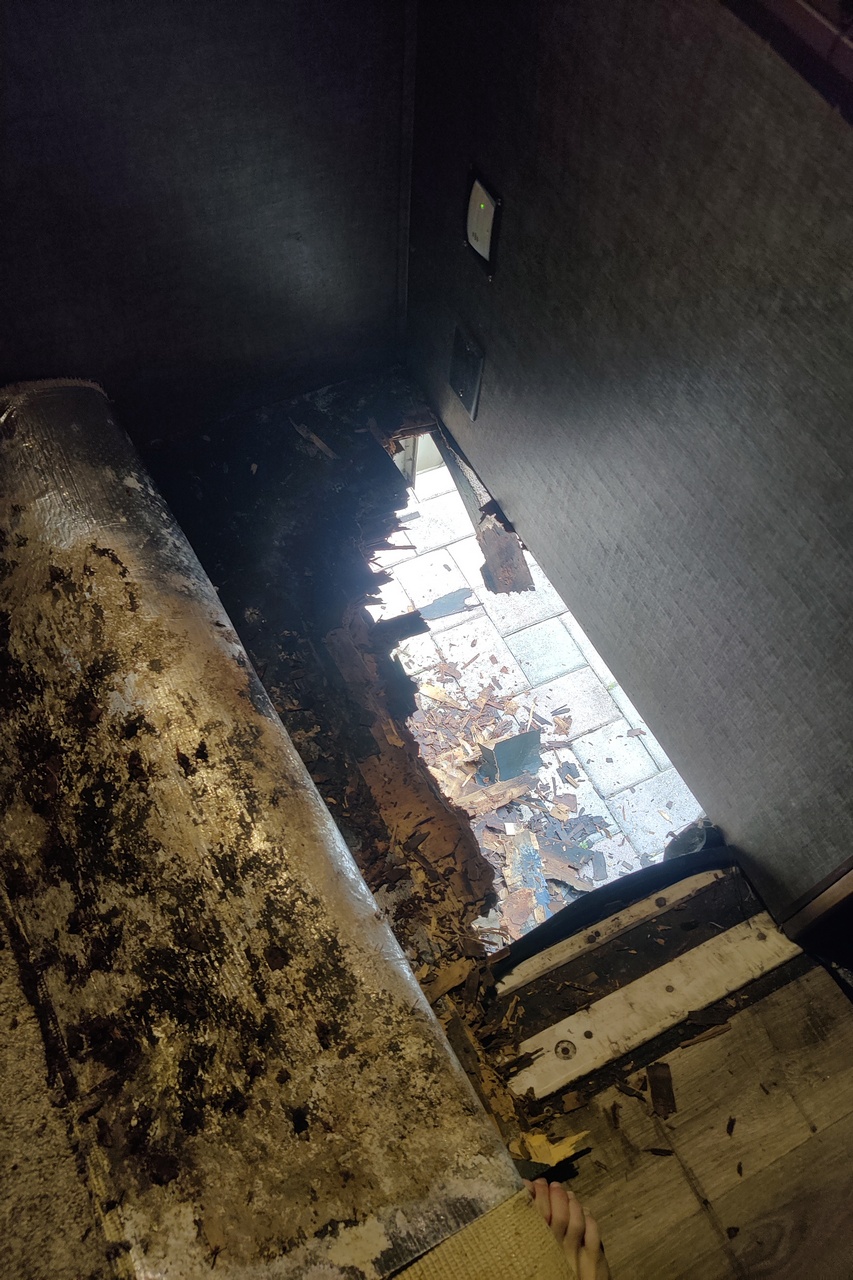 So, with a great deal of trepidation, I pulled up the carpet covering that corner of the slide (after moving the recliner off the carpet). I was horrified to discover that the rotted area had grown to about 3 ft by 1.5 ft. I set to work removing the rotted wood. In a few minutes I had removed great clumps of wet, rotted plywood, opening a hole in the floor so that I could see the pavers below.