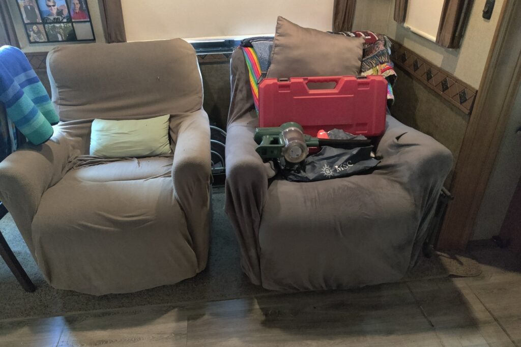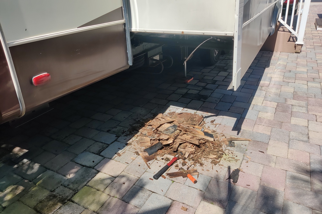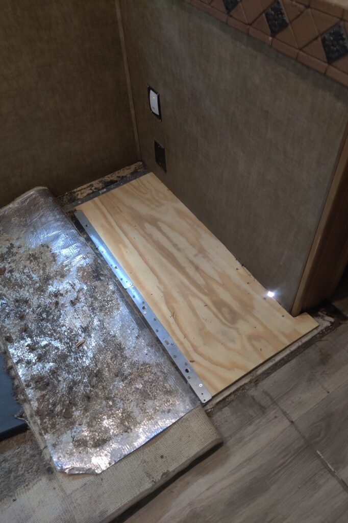 If you have been reading this blog for more than 4 years you might recall that way back in October 2018 some rotted wood was discovered on the floor of one of the large slides in the RV. I dealt with that problem then by installing a metal plate that covered the rotted plywood – about a foot square – on the underside of the slide and that seemed to be sufficient. At least it kept the slide functional for years. Until now.