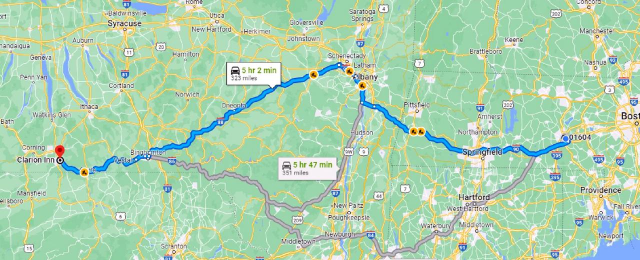 323 miles via I-90, I-87, I-88 and I-86 with a breakfast stop in West Springfield MA. Cumulative TS8 route miles: 323.