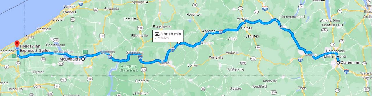 202 miles via I-86 and PA 89, with a lunch stop in Falconer NY. Cumulative TS8 route miles: 532. Cumulative car miles: 574. Miles since the end of Hop 1: 246. The 44 extra miles were due to the trip to the Corning Museum of Glass.