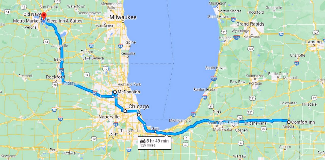 329 miles via I-90, I-290 (west and northwest of Chicago), US 14, and I-90 again with a lunch stop in Palatine IL and a shopping trip (Old Navy and a food store) before we arrived at our hotel. Cumulative TS8 miles: 1187. Cumulative car miles: 1249. Miles since the end of Hop 3: 333. The 4 extra car miles were due to dinner out in Fremont IN.