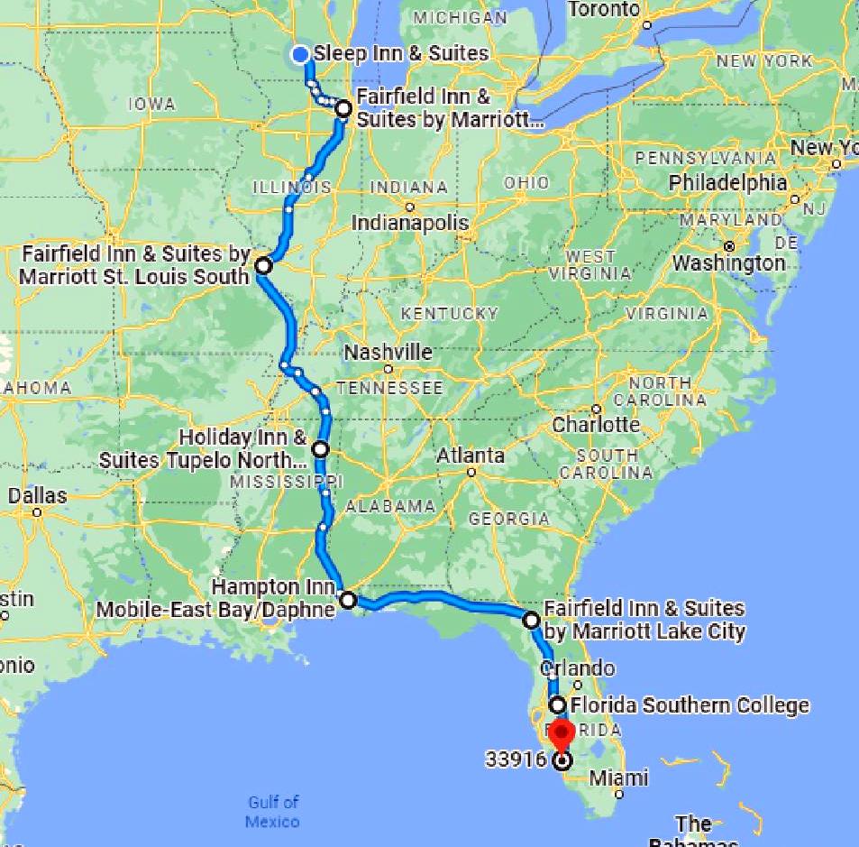 After discussing our plan for getting from Madison WI back to Ft Myers – a plan that featured stops in Asheville NC and Savannah GA – and looking at the prices for Biltmore ($79 each, or more), we decided to change the route to include a stop to see Ooma’s sister near Mobile AL. So the revised TS8-2 itinerary is as follows: