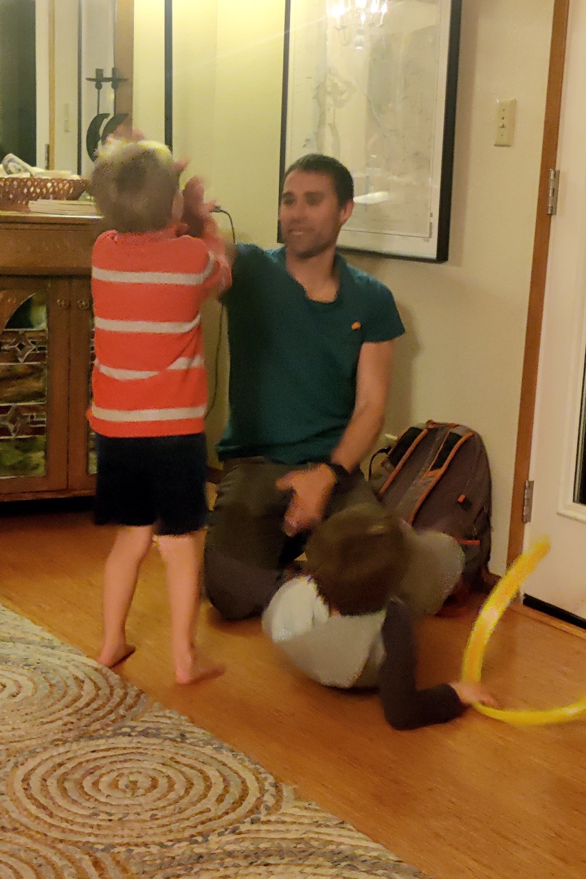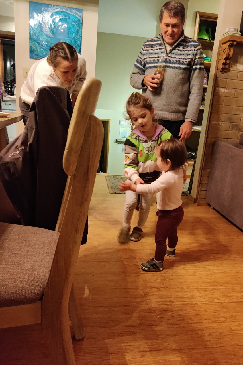 The evening was conversation and roughhousing. The kids were energetic and wanted to gang up on the old guys – mostly brother-in-law Chris (grandfather to all) and me, but Michael jumped in at the end. Hopefully we tired them out and they slept well.