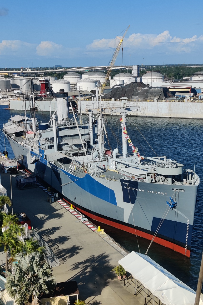 We explored the ship a bit. We found the cruise director, Joey, and had a nice chat with him. Turns out that Marlene knew his fiancé who is a cruise director on another Carnival ship. I also took a picture of the American Victory, a WWII vintage ship that is now a floating museum in Tampa. We were docked right next to it.