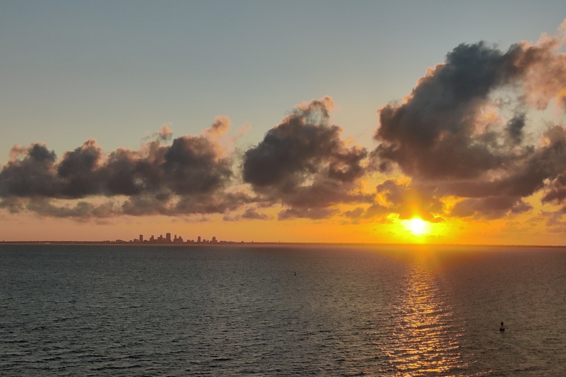 I was amazed at how long it took to exit Tampa Bay – nearly 2 hours. This bay is HUGE. But we got a lovely view of the sun setting over St Petersburg.