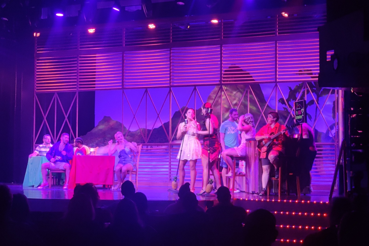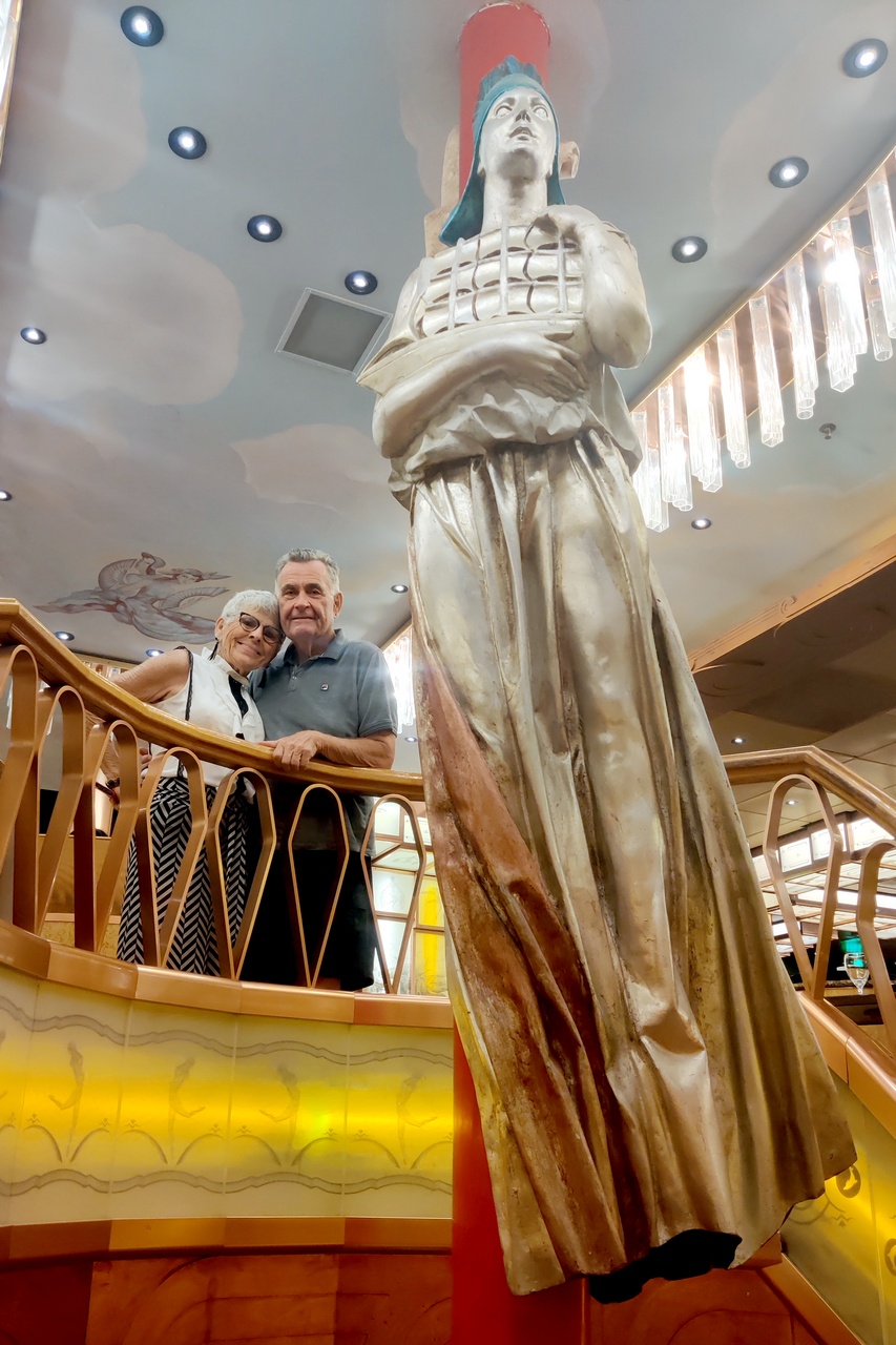 We are now nearly halfway to the Azores with a lot of water under our hull – over 17,000 feet. This was another fairly quiet day. Lots of reading. Some casino time, too. I am now officially losing, but only by about $20. We both had tilapia for dinner. Very good. We saw another theater show after dinner – “Getaway Island” featuring many tropical songs. Very nicely done.