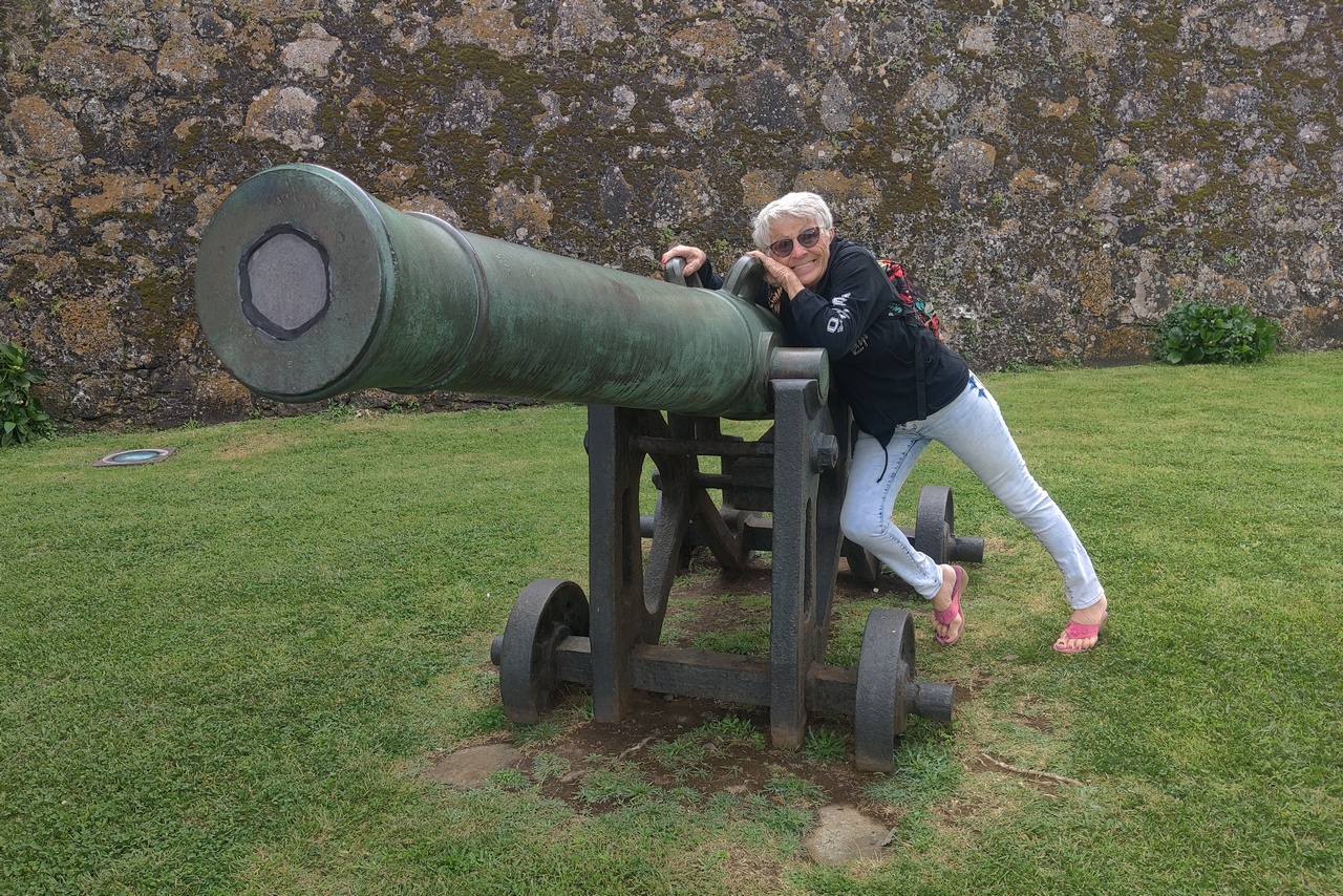 It was a cool, mostly cloudy day so the photos are not postcard quality. We didn’t eat lunch on shore but did buy a couple of fresh-made pina coladas which were very tasty. And saw a very picturesque carriage. We also got some walking exercise, finally, as we walked into town from the pier, along the harbor and past the 16th-century fortress that guarded the harbor.