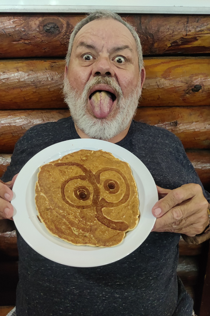 Saturday morning we decided to drive to Mt Dora – over 3 hours away, north of Orlando – for an overnight, the hotel courtesy of Marlene and Dottie. We stopped at the Log Cabin on our way out of town for a great breakfast. The cook prepared a special pancake for the birthday boy.