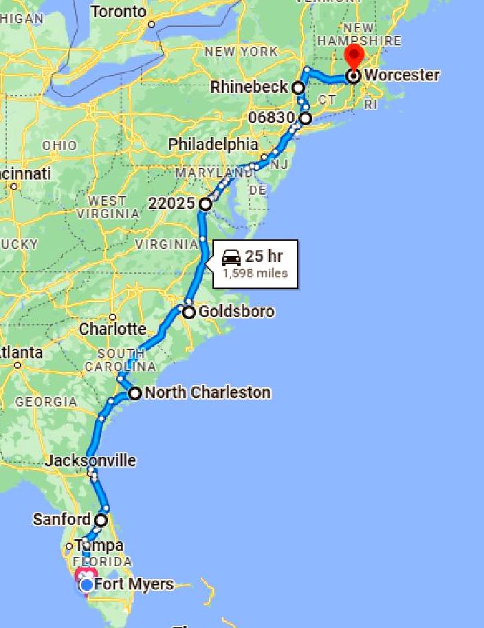 The trip will be about 1,600 miles in (probably) 4 hops over a total of 10 days/9 nights. Long days of driving but with breaks in Charleston SC (2 nights), Montclair VA (3 nights) and Greenwich CT (2 nights). I will be making lunch stops in Sanford FL and Rhinebeck NY to see old friends.