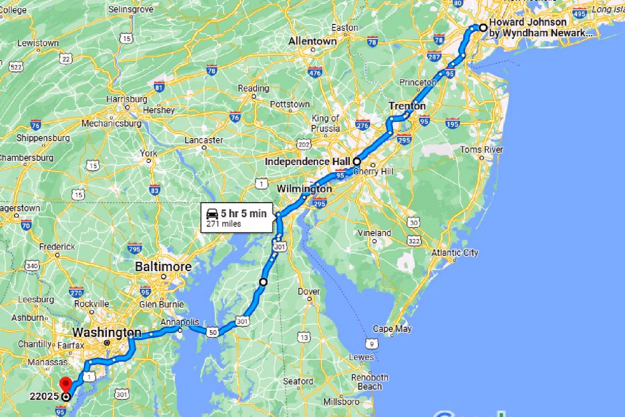 275 miles via I-78, Garden State Parkway, US 1, I-95, US 1 again, local streets to Independence Hall in Philadelphia, I-95 again, DE 896, US 301, US 50, I-495 (around Washington DC), I-95 again, VA 234 and local streets. Miles since the end of Hop 1: 329. Cumulative route miles: 477. Total TS9 miles: 531. The extra miles were due to our trips to Liberty State Park (to get the ferry), to Staten Island (to get the ferry) and some short shopping trips.