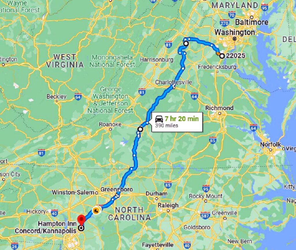 This hop was a bit embarrassing. For reasons that elude me, I was convinced that our destination was the Hampton Inn. When we got there they did not have a reservation for us. I searched my laptop and could not find a confirmation. Fortunately, they had rooms available, and I was able to get one for a good rate. But once we got into the room I found the confirmation – for the Wingate Hotel in Concord. I quickly got online and was able to cancel that reservation without any penalty. But how did I get the destination wrong? No excuse – I had the Wingate in my itinerary spreadsheet. Chalk it up to “senior moment.” Embarrassing, for sure.