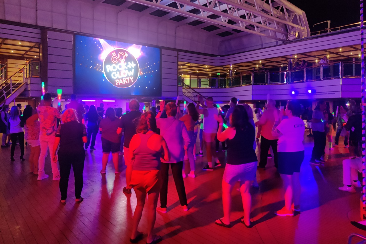 A nasty day at sea. We sailed to the east of Typhoon Koinu but felt the effects of its recent passage – 8- to 10-foot seas, After breakfast and some (poorly performed) trivia contests I was feeling nauseous and went up to the cabin. And slept most of the afternoon. I skipped lunch entirely and had only a salad for dinner, By evening both the seas and my stomach were calmer and I went up to the 80’s dance party by the pool. Then had some pizza,