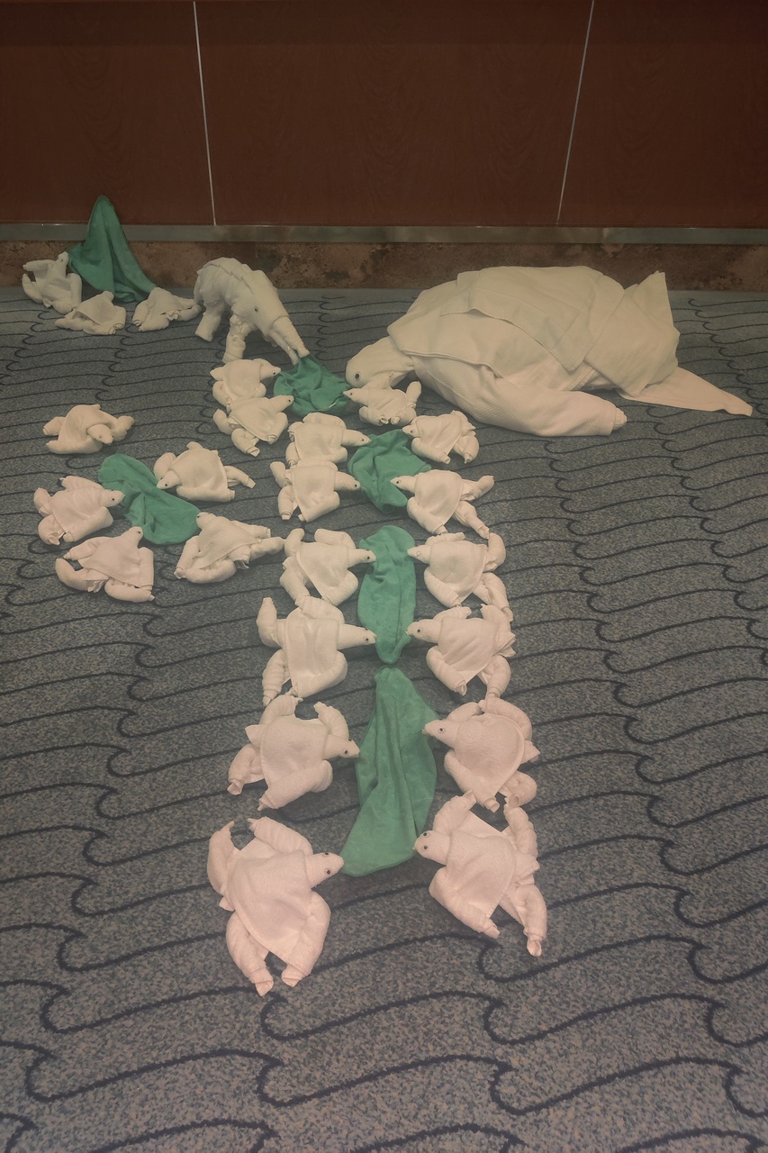 I will add that on this day we also viewed, for the first time, the elaborate towel-art display that has been the talk of the ship. It is common, on board a cruise ship, for a cabin attendant to leave a towel-art animal after cleaning the room. But one attendant on the Luminosa has been leaving elaborate towel-art scenes, first in the 6th floor hallway and then, when it attracted too much attention, in the 6th floor elevator lobby. Every day he constructs a different scene, usually with a smooth transition from one day to the next. For example, one day he had a turtle laying eggs and the next day had many small turtles emerging from the eggs. Very creative.