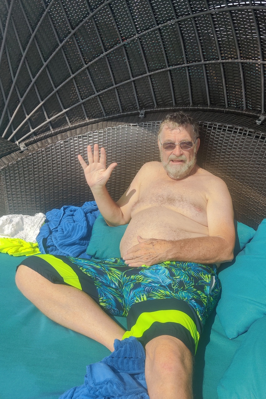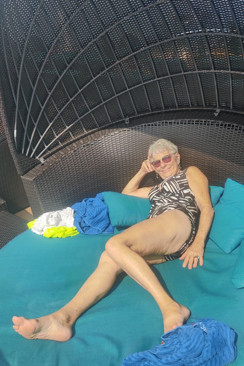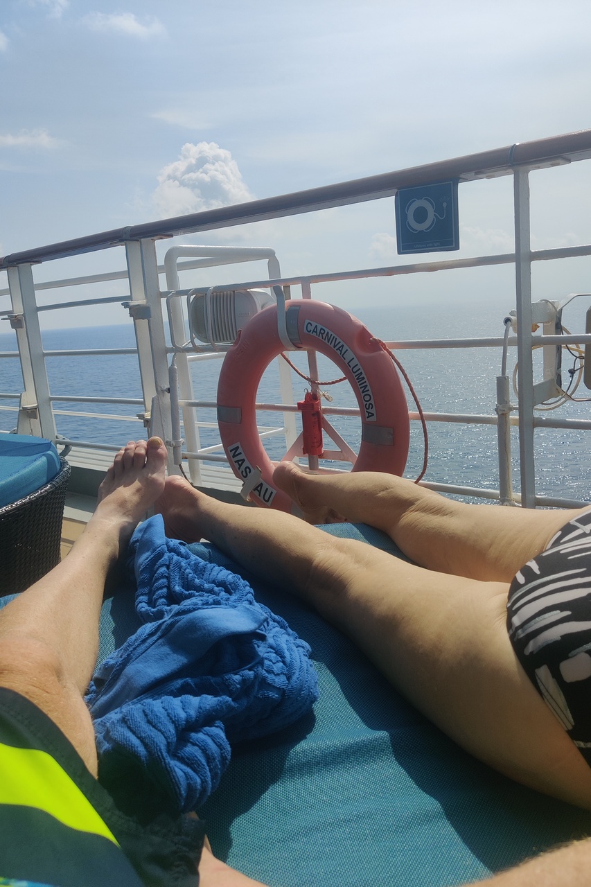 After breakfast we played cards until noon, then Marlene and I took ownership of a Serenity Deck cabana and jumped (literally, for Marlene, earning her a harsh reprimand from the pool attendant) into the pool. After splashing about and socializing for a bit we retired to the cabana and spent a leisurely hour sunbathing and enjoying the beautiful day.