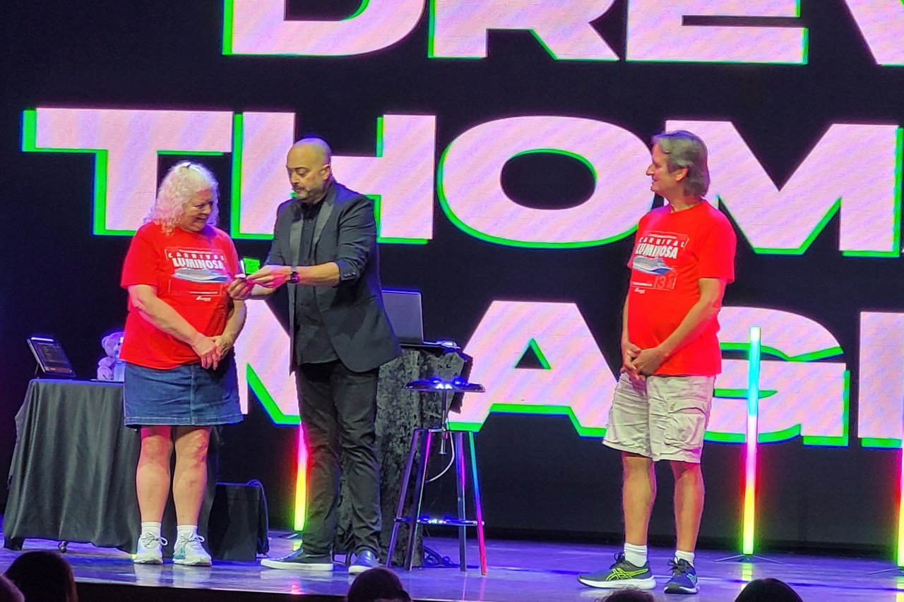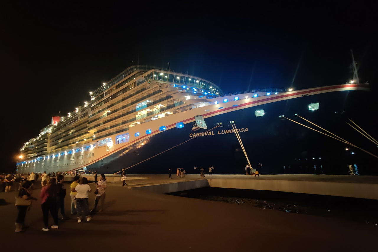 We got some nice night photos of both the Luminosa and a smaller ferry. Then we reboarded the ship and went to the evening show, a very nice one by mentalist/magician Drew Thomas.