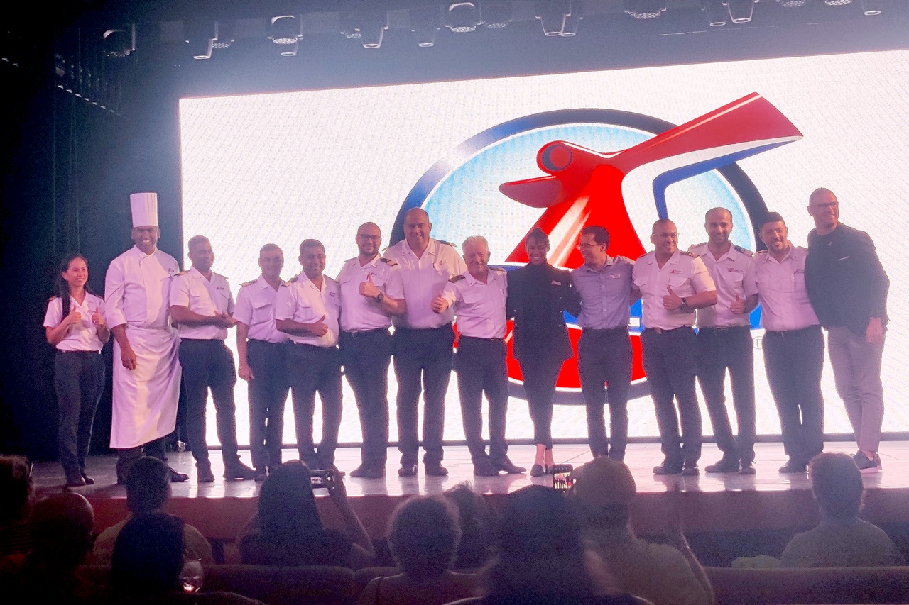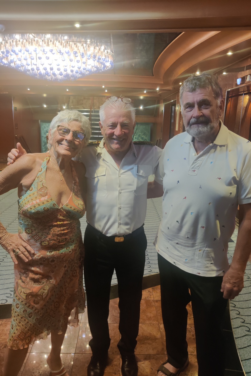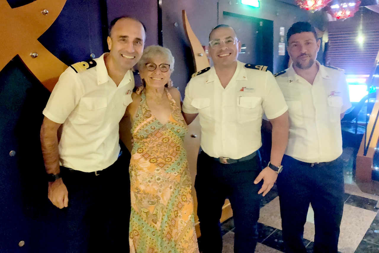 After lunch I read a bit, then attended the party for Platinum and Diamond guests (these are the highest designations that Carnival has, based on days sailed on Carnival ships). I am only Gold, but Marlene is Platinum so I was able to attend as her plus-one. It is basically a chance to hobnob with senior officers – including the Captain – but does offer free drinks. LOTS of free drinks. Marlene had two and I had four.