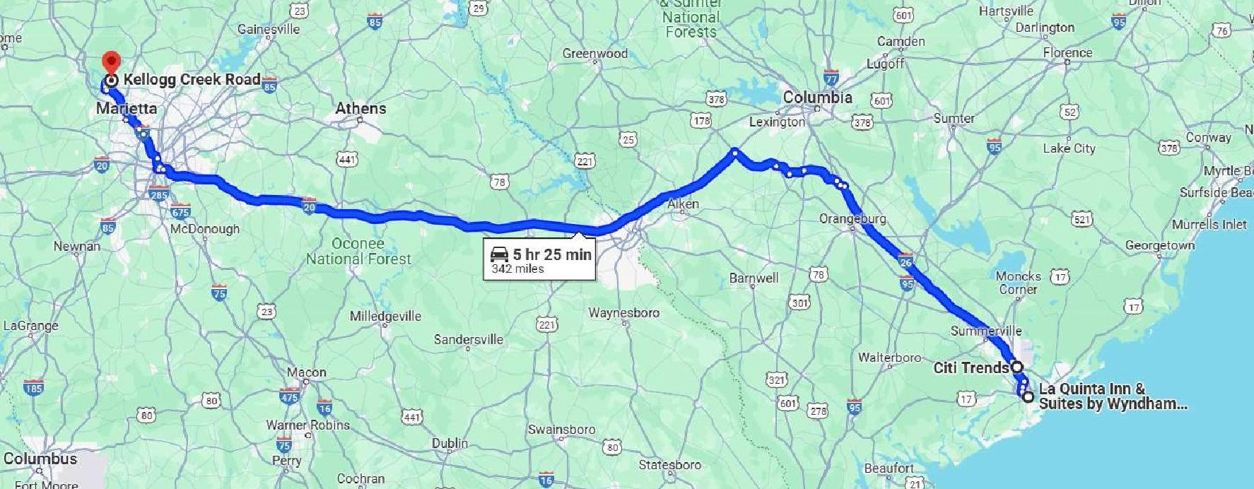 This was a complicated route that included some small rural highways. But the weather was good and the GPS kept me from getting lost. We had a stop in North Charleston to return some clothing. That was supposed to be a brief stop but, as is often the case with clothing stores, turned into a 90-minute stop. We also stopped in GA, near Atlanta, for fuel and food (KFC).